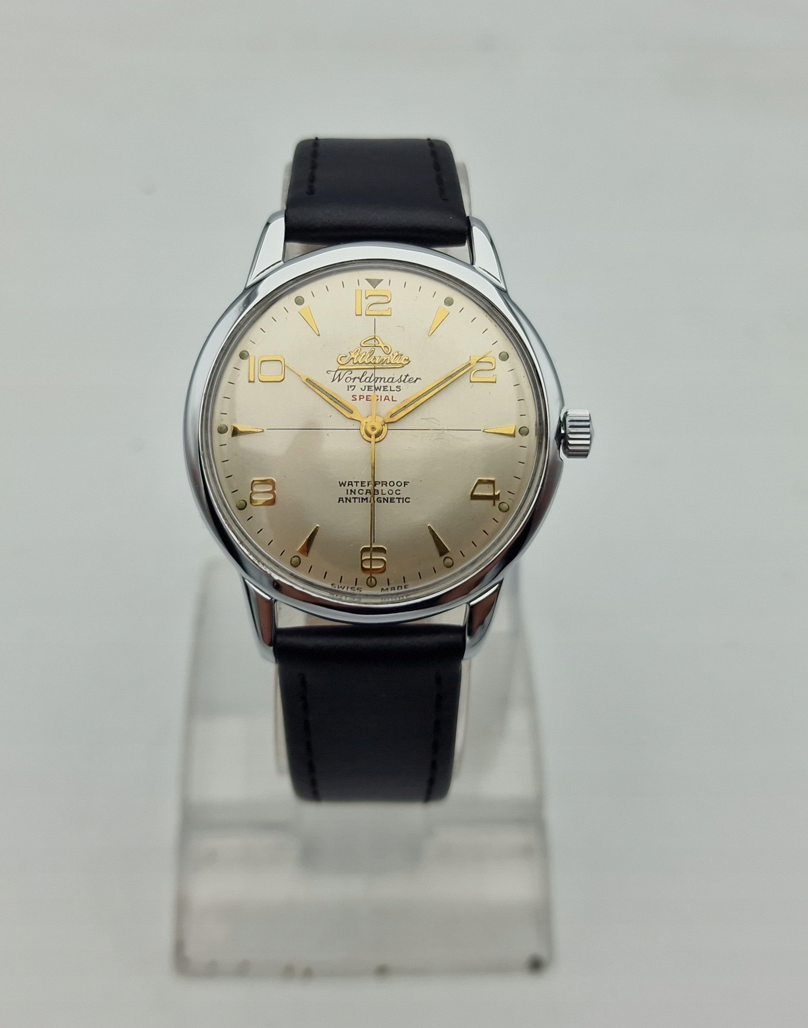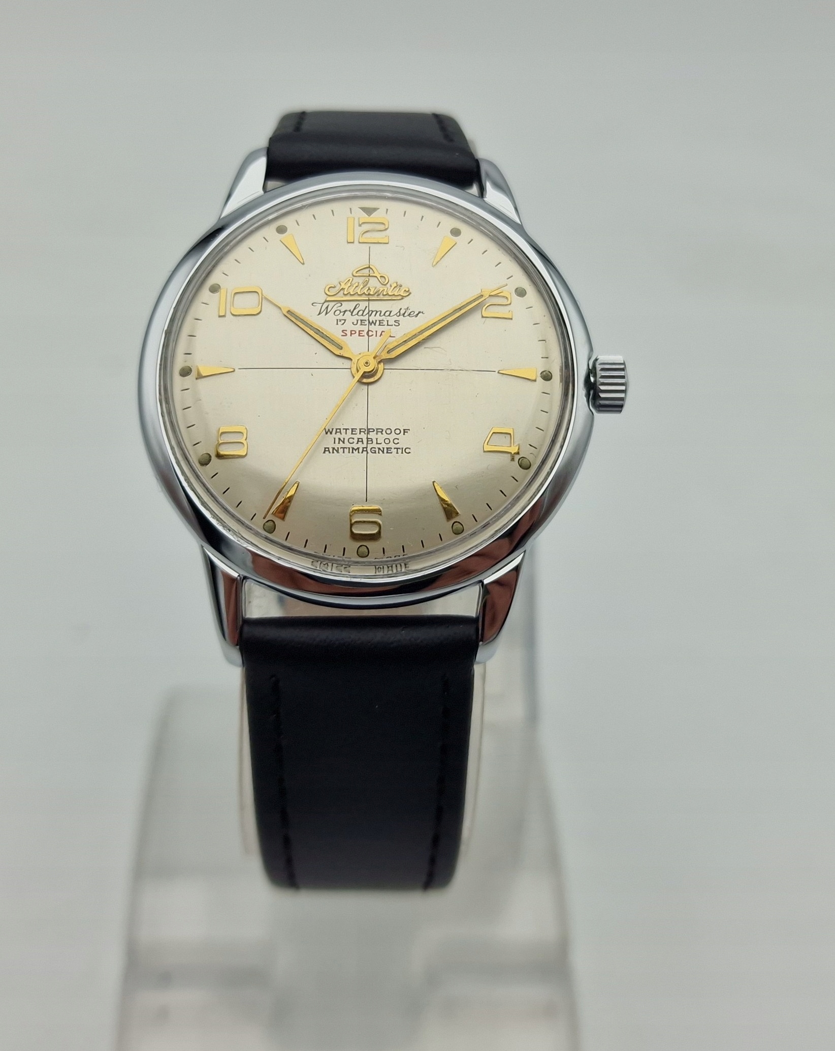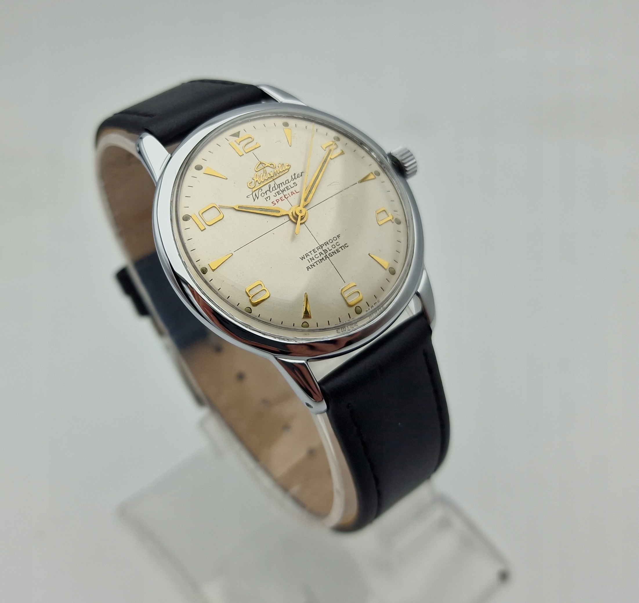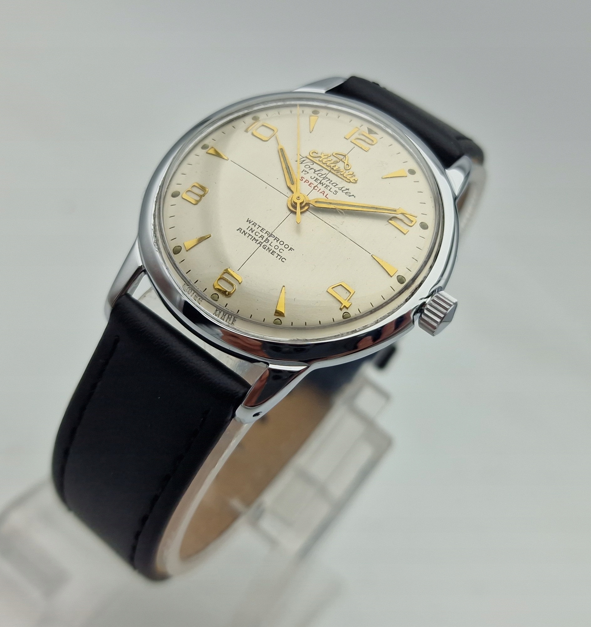 - Срібний металевий циферблат із золотими годинниковими мітками. Оригінальний циферблат із підписом: «ATLANTIC WORLDMASTER , SPECIAL, 17 JEWELS, ANTIMAGNETIC, INCABLOC, WATERPROOF, SWISS MADE». Циферблат в ідеальному стані, не реставрований.