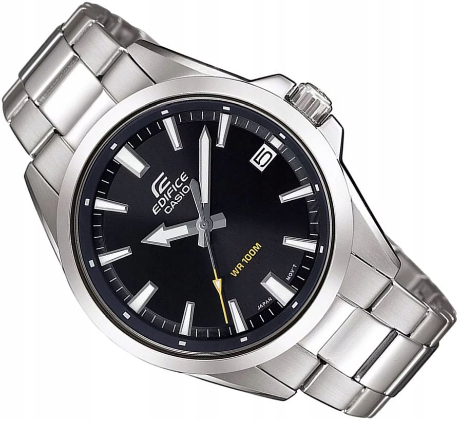 Годинник CasioEdifice EFV-100D -1AVUEFмає мінеральне скло, корпус і браслет з нержавіючої сталі. Максимальний обхват 21 см (вимірюється конверт з ремінцем). Дисплей дати на 3 годині показує поточний день місяця. Покажчики та стрілки мають покриття neobrite, шар, який світиться в темряві після впливу світла. Додатковою перевагою моделі є водонепроникність 100 м, що дозволяє вільно плавати.