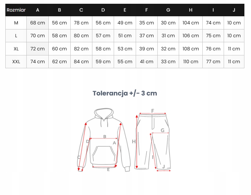 Світшот застібається на блискавку, має капюшон, який регулюється шнурком, і бічні кишені. Штани оснащені еластичним поясом на кулісці і регульованою куліскою, а також бічними кишенями. Матеріал з домінуючим вмістом бавовни гарантує комфорт і повітропроникність, а додавання поліестеру підвищує міцність і стійкість до зминання.