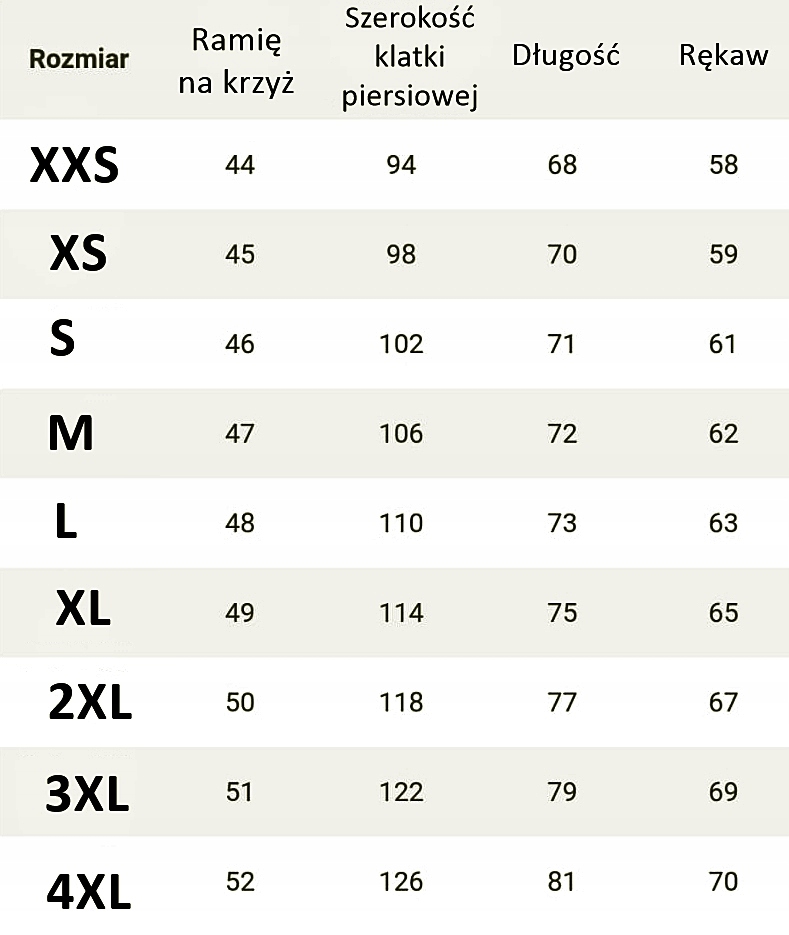 - XS, S, M, L, XL, 2XL, 3XL, 4XL