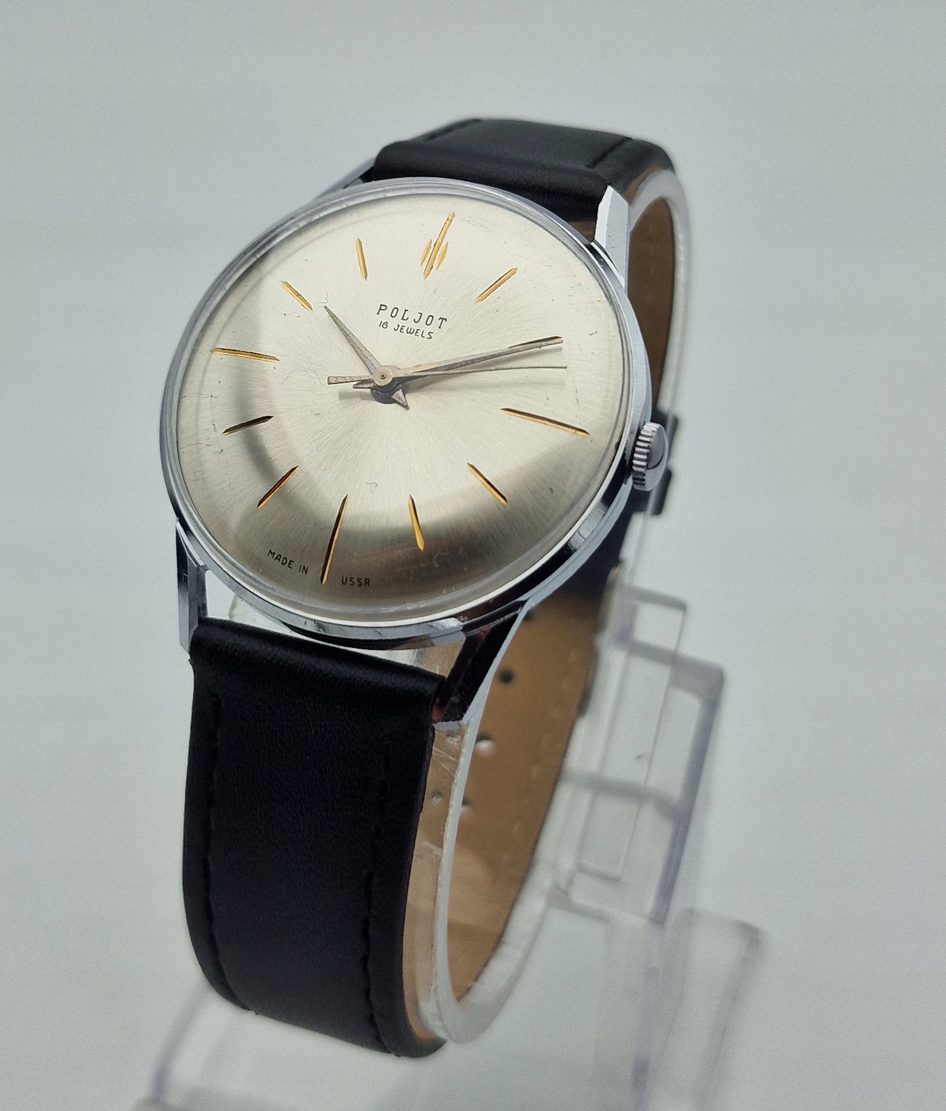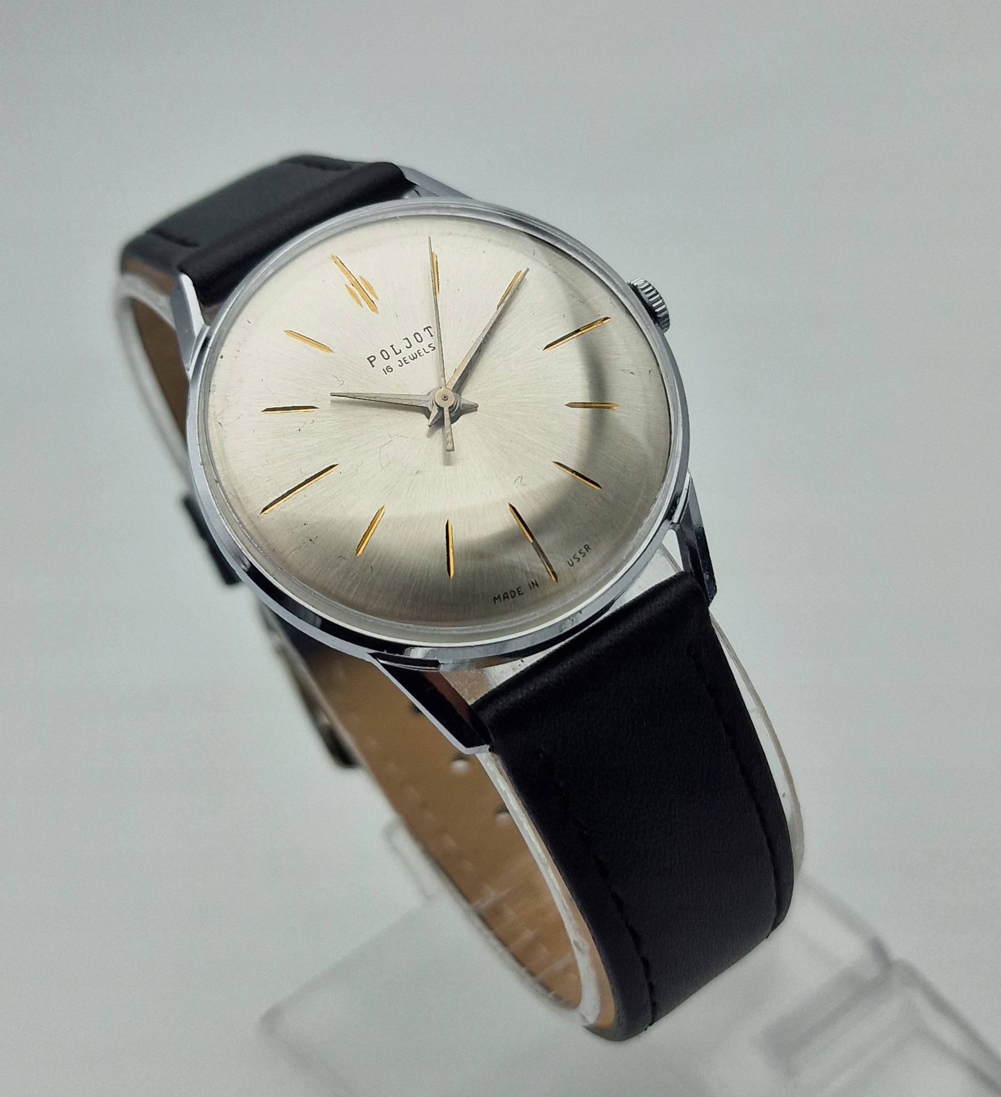- Срібний металевий циферблат із золотими годинниковими мітками. Циферблат підписаний: «POLJOT 16 JEWELS, MADE IN USSR». Циферблат майже в ідеальному стані.