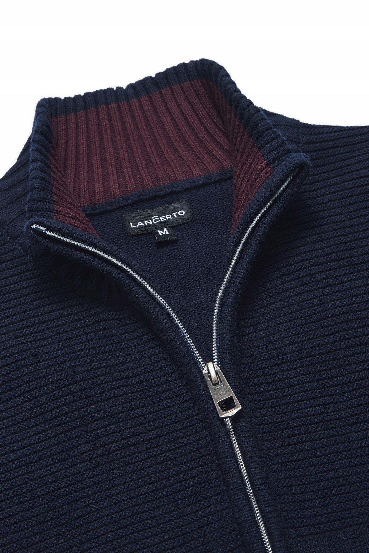 темно -синій чоловічий светр із зручним вирізом. Модель Крейга має блискавку, дві закриті кишені з боків, високий комір підставки та характерне, ребричне переплетення спереду. Колін підставки прикрашений контрастним кольором.