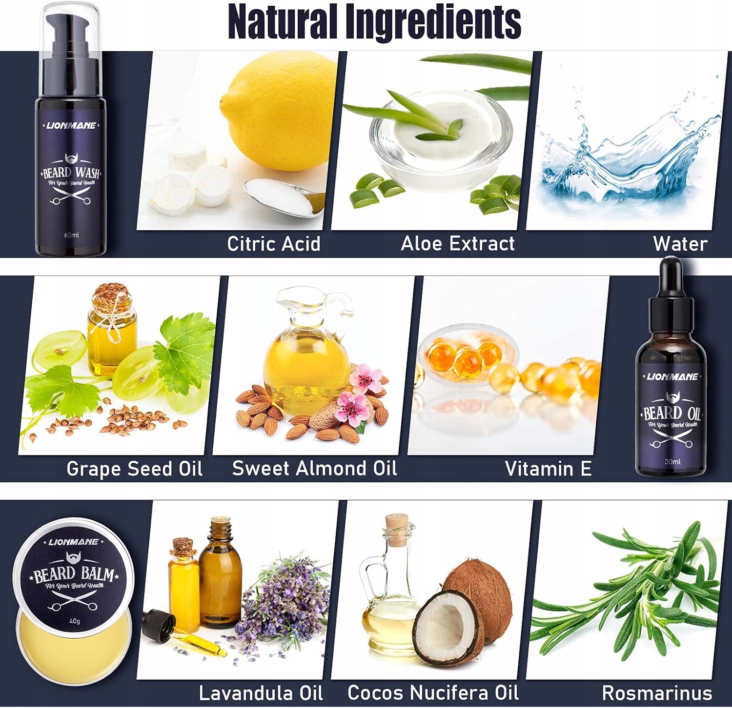 Олія для бороди, шампуні для бороди та кондиціонер для бороди з натуральними інгредієнтами включені для чоловіків для догляду за бородою. Доступна не лише інформація про бороду, після її нанесення та повніше, а й про глибоке коріння бороди, застосування лупи та шкірного сала, а також призначення бороди у використанні та покриття.
