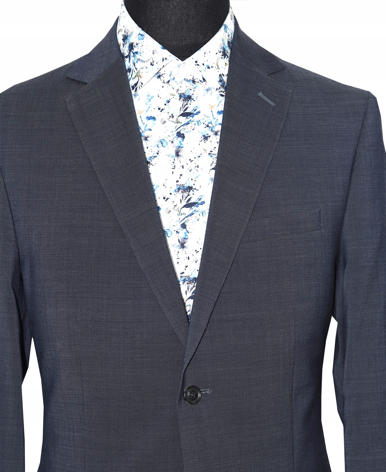 Піджак застібається на два ґудзики з прямими лацканами, розрізом на грудях та двома швами.