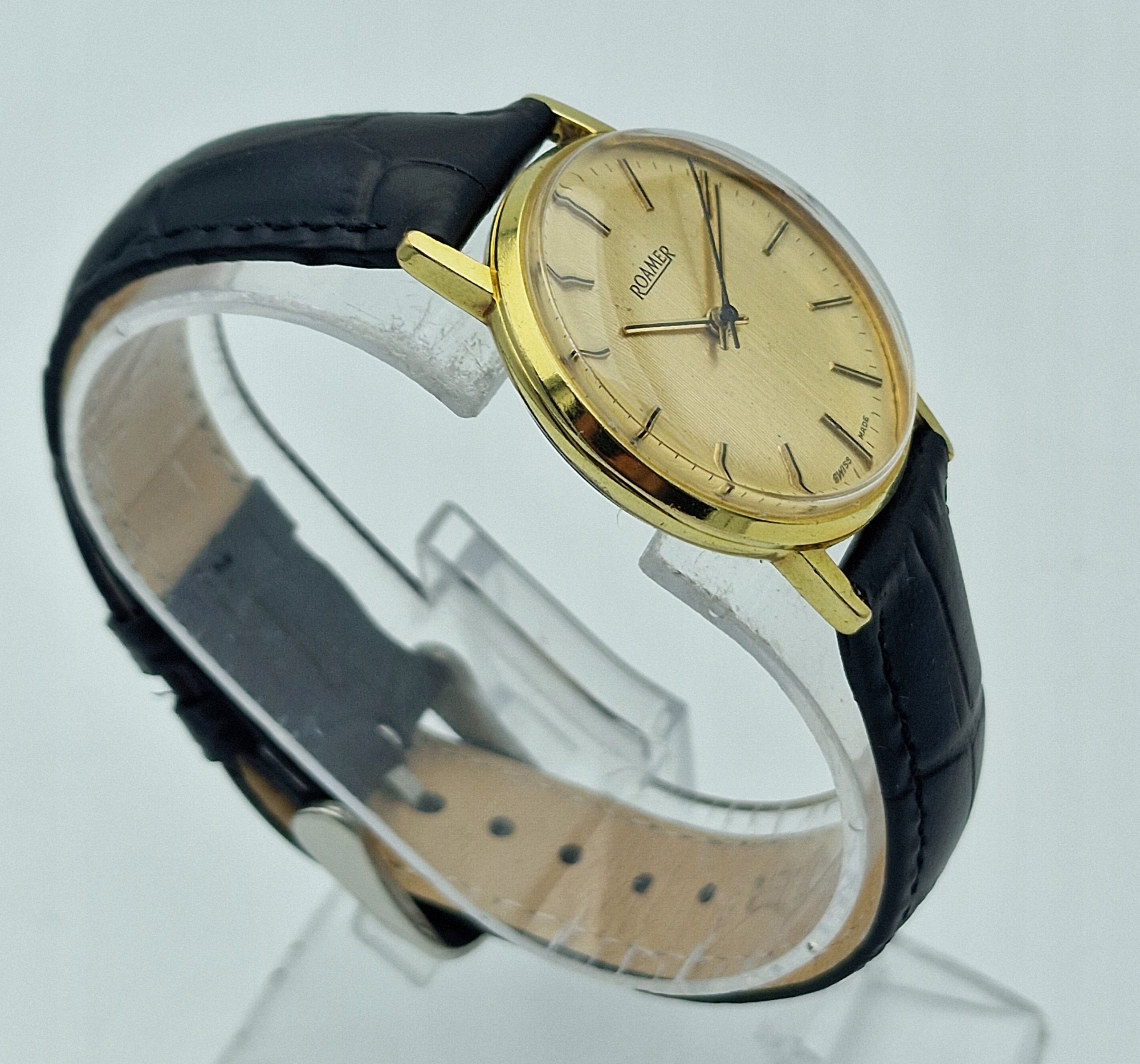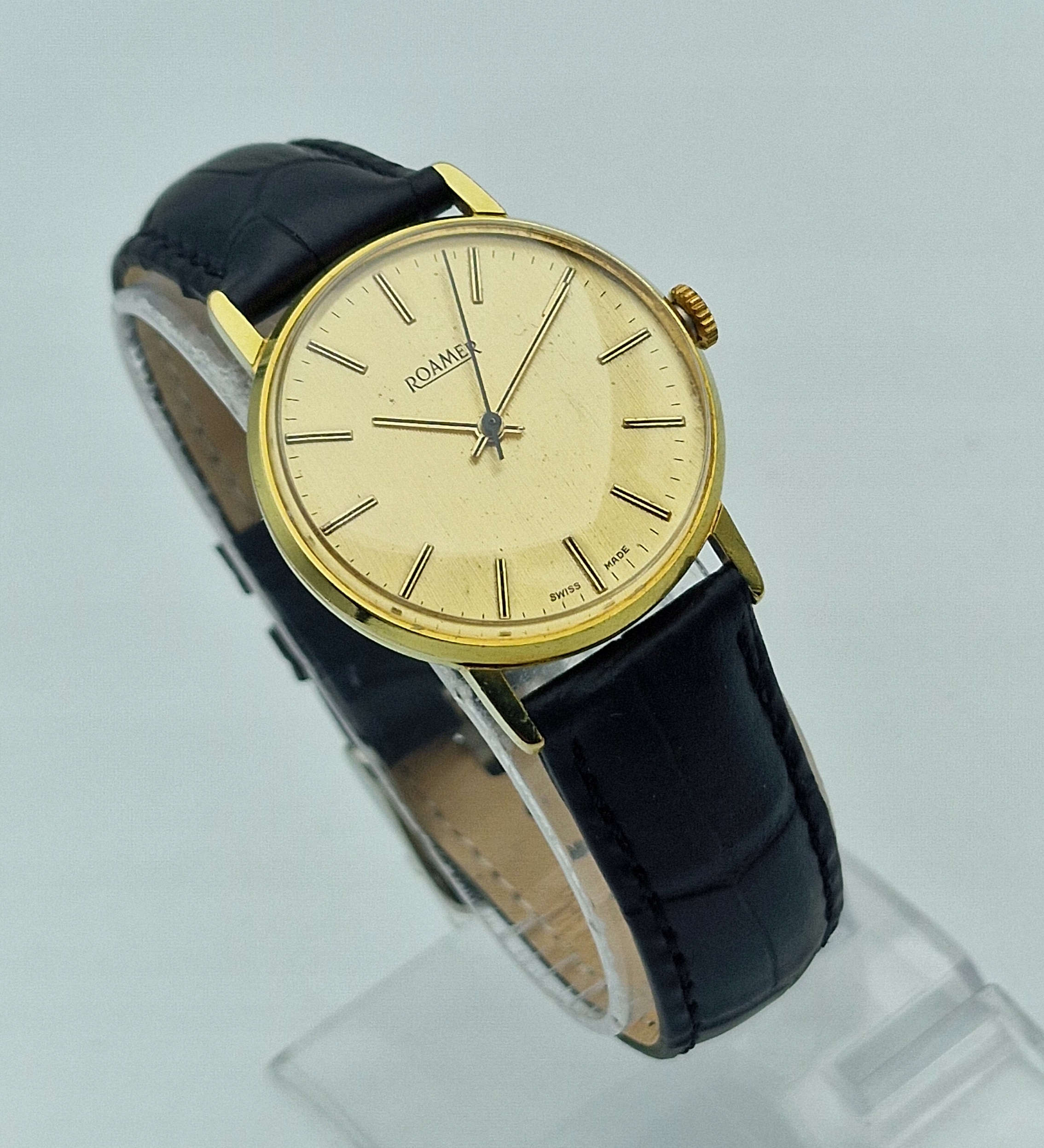 Цього разу я повинен запропонувати шалений годинник для цінителів та зачаровує. Це класична модель коштовностей Roamer 17 з 1960 -х років, у золотому конверті з Incabloc. Годинник на гарній прогулянці. Майже в ідеальному стані для вашого віку ...