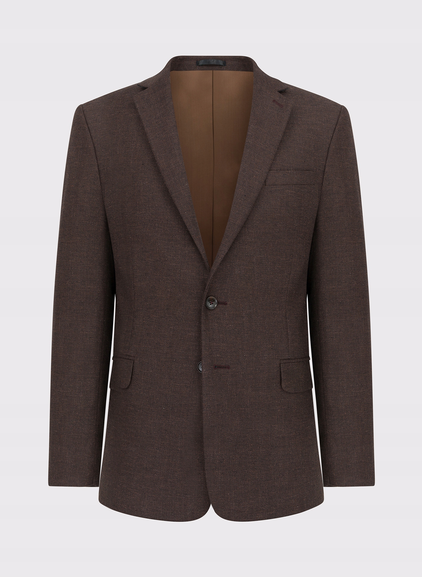 Чоловіча куртка з колекції Pako Lorente коричневого кольору, присвячена сезону осінь-зима . Виготовлений з натуральної тканини, що складається з вовни, бавовни та льону, з мінімальним додаванням поліаміду та еластану. Матеріал з видимою структурою, всередині підкладка з віскози більш світлого коричневого кольору. Модель однобортна, застібається на два гудзики. Дві кишені з клапанами спереду. На грудях зліва є бруст, який можна доповнити кишенькою з малюнком.