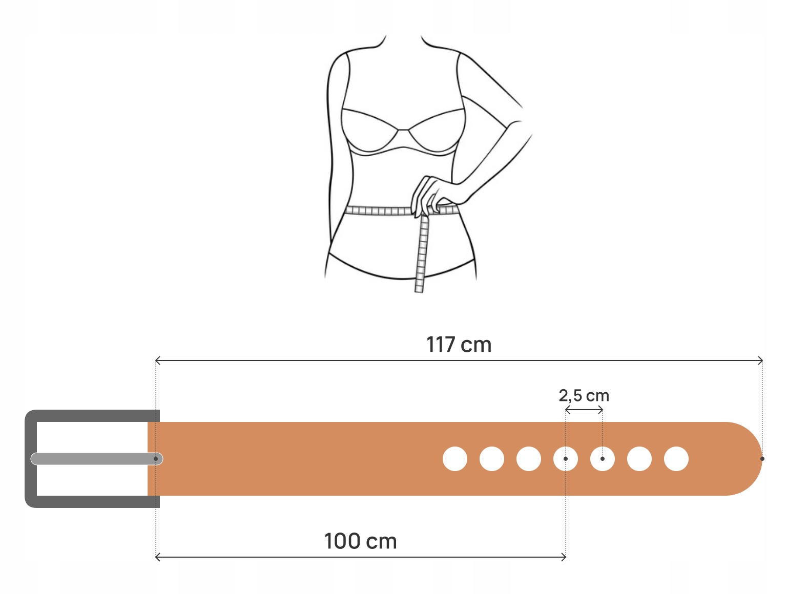· Загальна довжина (вимірюється від пряжки до кінця ременя) не така, як розмір! Переконайтеся, що ви купуєте ремінь розміру, визначений відповідно до вказівок, видимого вище.