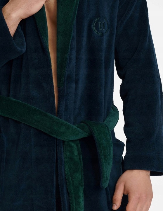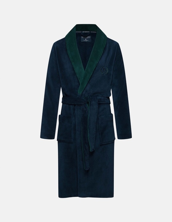 Елегантний чоловічий халат HENDERSON UNREAL темно-синього кольору з зеленими аксесуарами виготовлений з м’якої флісової тканини, яка забезпечує комфорт і добре зберігає тепло. На рівні грудей є вишивка з логотипом бренду. Це надзвичайно зручний халат вільного повсякденного крою довжиною до коліна. Підв'язується на талії широким поясом, а спереду конверт, широкий комір і дві великі кишені для дрібниць додають практичності.