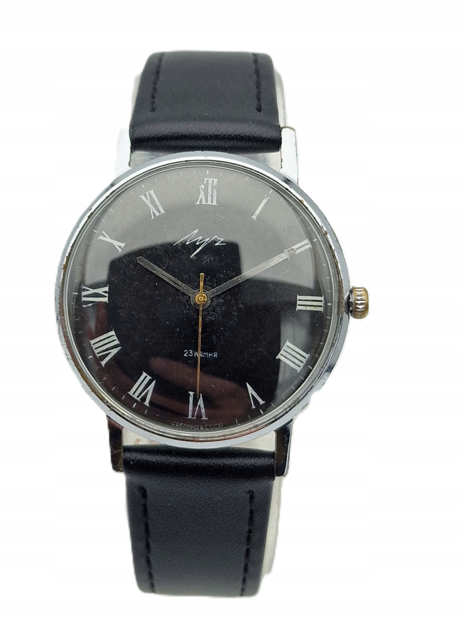 - Чорний металевий циферблат із білими римськими цифрами. Щит із підписом: «ЛУК, 23 КАМЕНІ, ЗРОБЛЕНО CCCP». Циферблат у дуже хорошому стані.