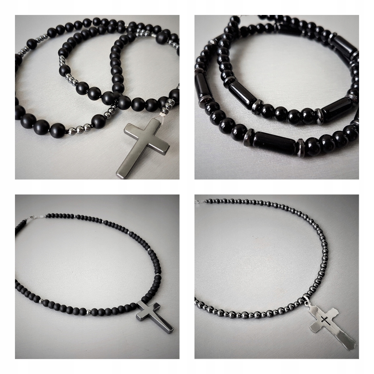 Матеріал - декоративні кульки з оніксу діаметром 8 мм, кульки з гематиту 4 мм, хрестик з гематиту 3,2 см/2,2 см, міцний гнучкий ювелірний шнур.