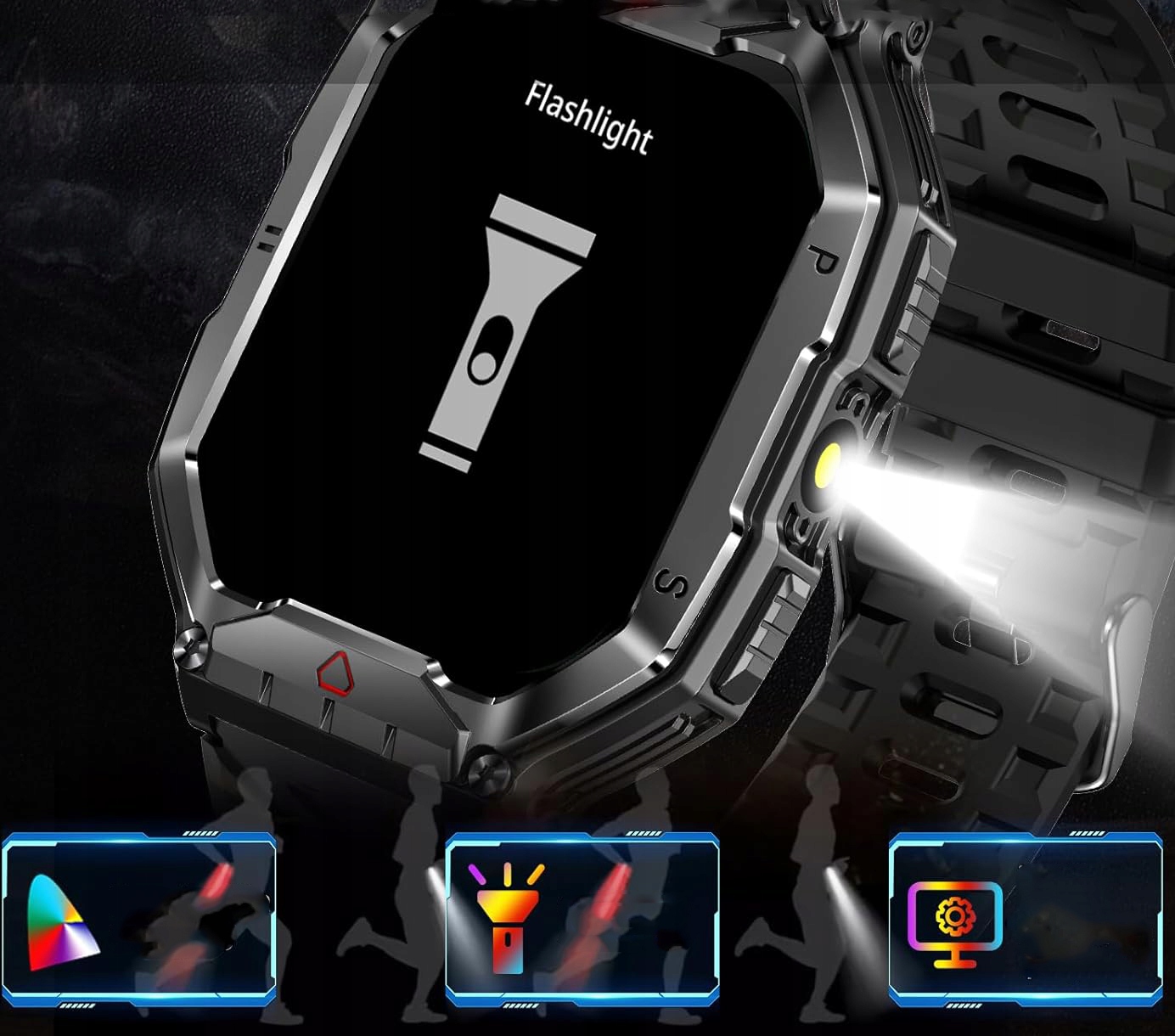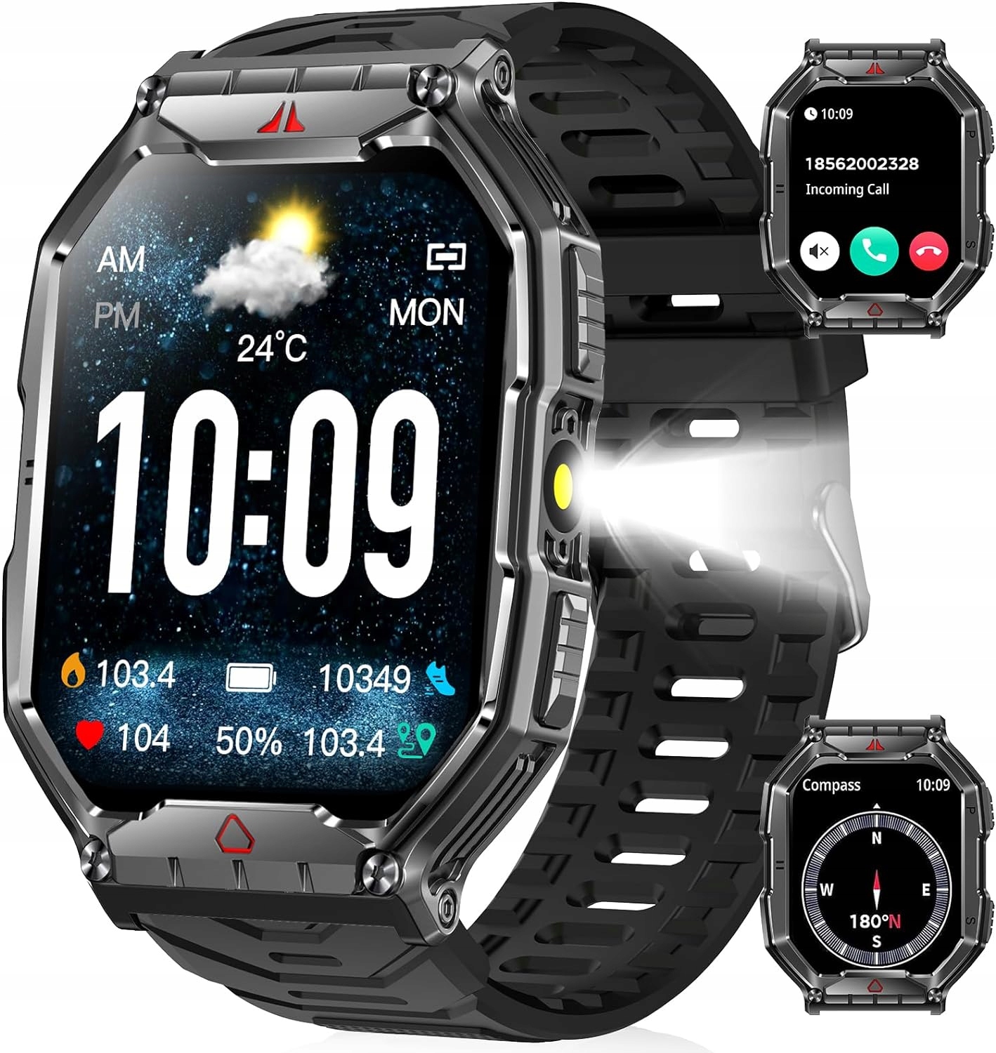 - ☑️Крім того, міцний розумний годинник поставляється з невеликим ліхтариком збоку, який забезпечує зручну функцію під час пригод на природі та допомагає освітлювати вам шлях на природі.