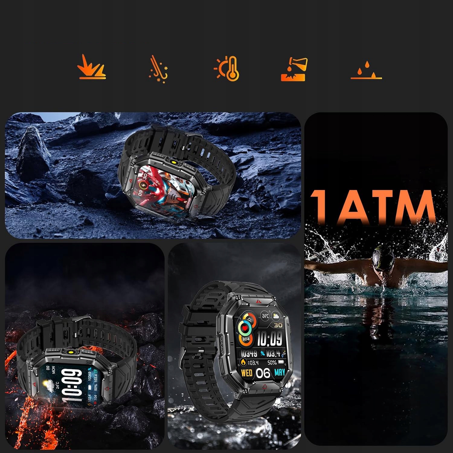 - ☑️Військовий розумний годинник пройшов багато військових випробувань, зокрема морозостійкість до -40 °C, термостійкість до 70 °C, ударостійкість, водонепроникність та < b >Стійкість до пилу та соляного туману, що робить його ідеальним вибором для використання в складних умовах.