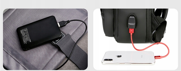- Рюкзак має вбудований зовнішній порт USB. Підключивши до нього павербанк, можна зарядити телефон. Примітка: банк живлення не входить до рюкзака