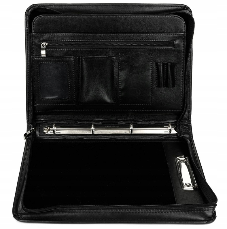 - зліва: 2 кишені для смартфона, документів, 3 відділення для візиток, 2 відділення для ручок, 1 відділення для документів формату А4, 1 відділення для документів формату А5, 1 відділення на блискавці для документів меншого розміру.