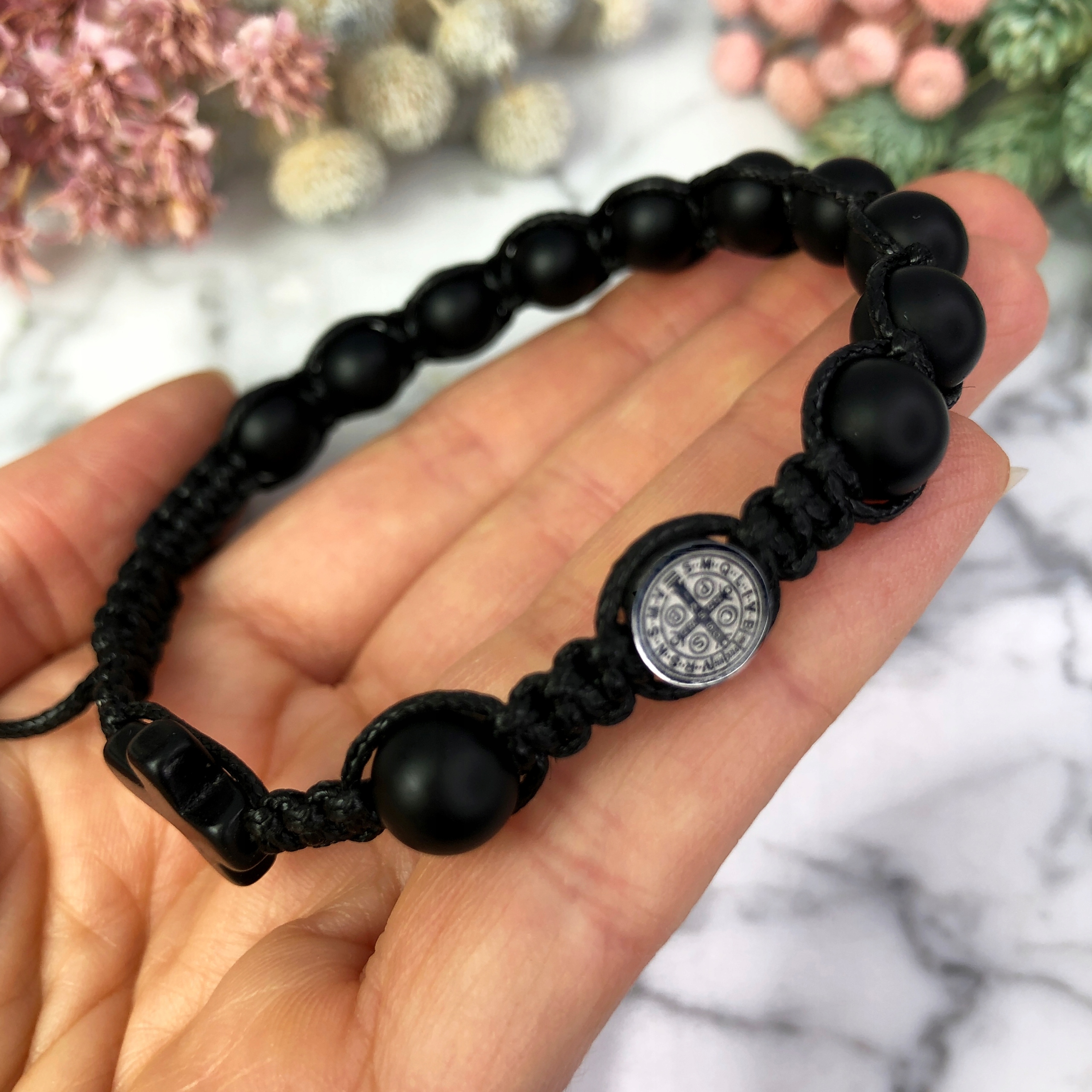 Браслет з натурального декоративного каміння - чорний матовий онікс з медальйоном Св. Бенедикт з нержавіючої сталі (хірургічної).
