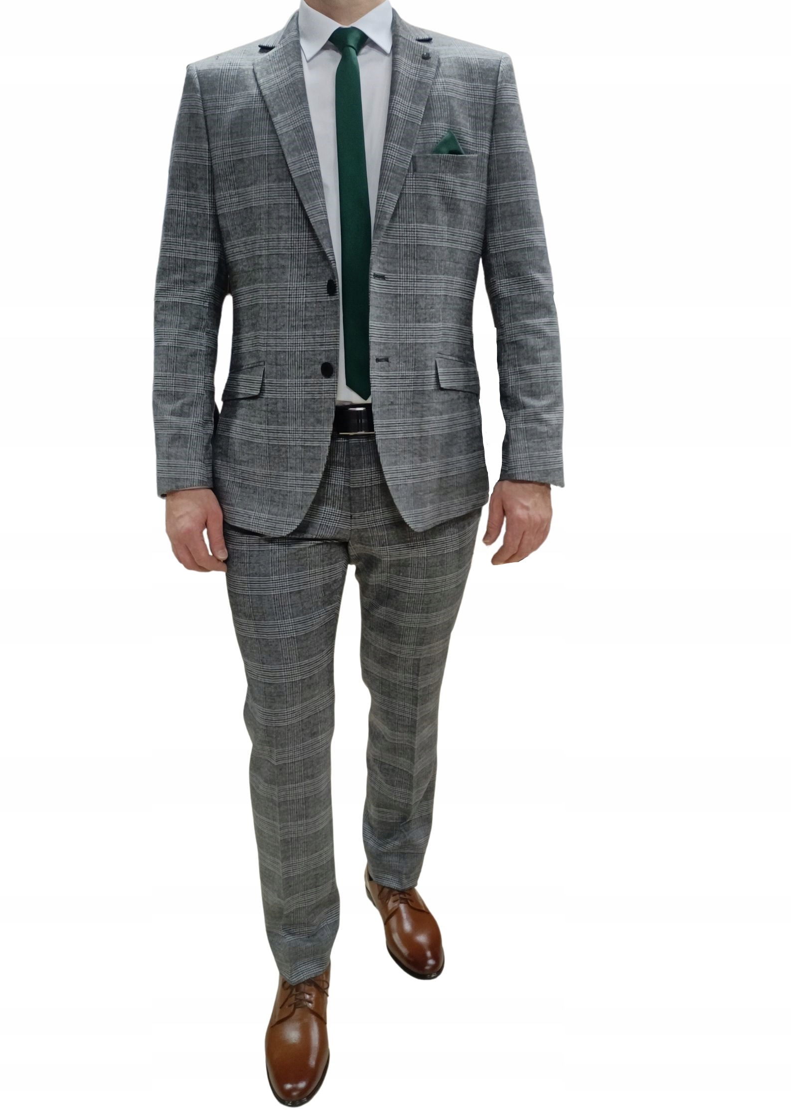 Чоловічий костюм у сіру клітинку з візерунком у сіру клітинку та зеленим, що робить його позачасовим. Приталений крій ідеально підкреслить достоїнства чоловічої фігури. Піджак застібається на два гудзики, має відкриті лацкани, розрізну складку та два шви, класичний крій. Це робить його придатним для багатьох випадків. Кишені з клапаном і внутрішні кишені роблять його практичним. Штани, запресовані в класичну складку, чудово струнять чоловічу фігуру.