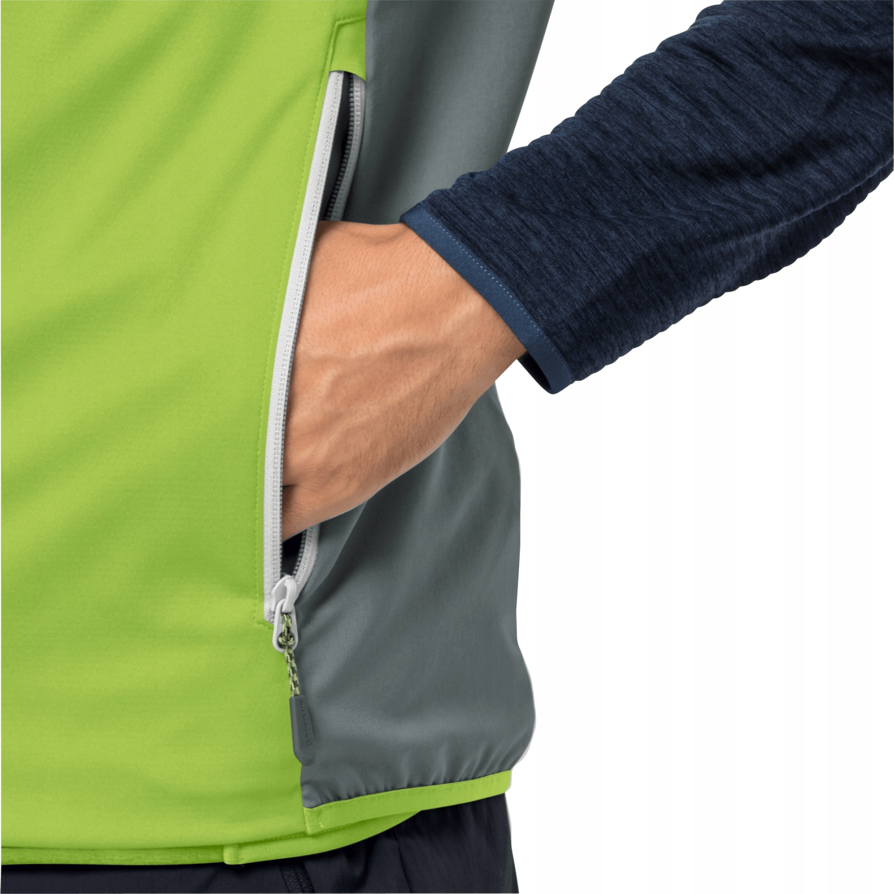 Її безперечною перевагою є поєднання двох матеріалів. На передній частині жилета вітрозахисна тканина STORMLOCK SOFTSHELL JERSEY 3L захищає від вітру, яка також не поглинає повітря, тому захищає від легкого дощу. Ззаду стійка до стирання тканина FLEX SHIELD, яка також не вбирає вологу, забезпечує достатню повітропроникність.