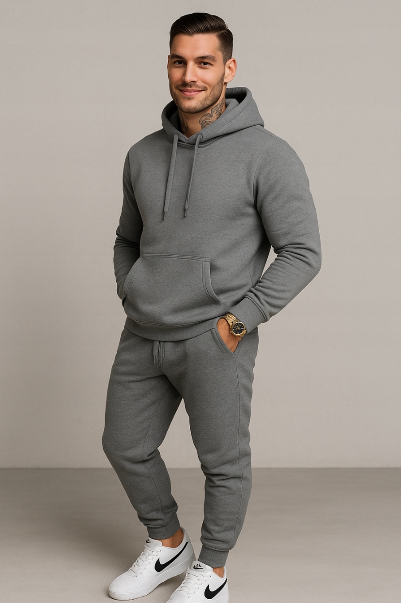 Стриманий елегантний темно-сірий комплект. Толстовка з капюшоном і практичною сумкою-кенгуру і вузькі джоггери забезпечують чистий міський стиль. Матеріал 65/35 міцний, простий у догляді та приємний на дотик.