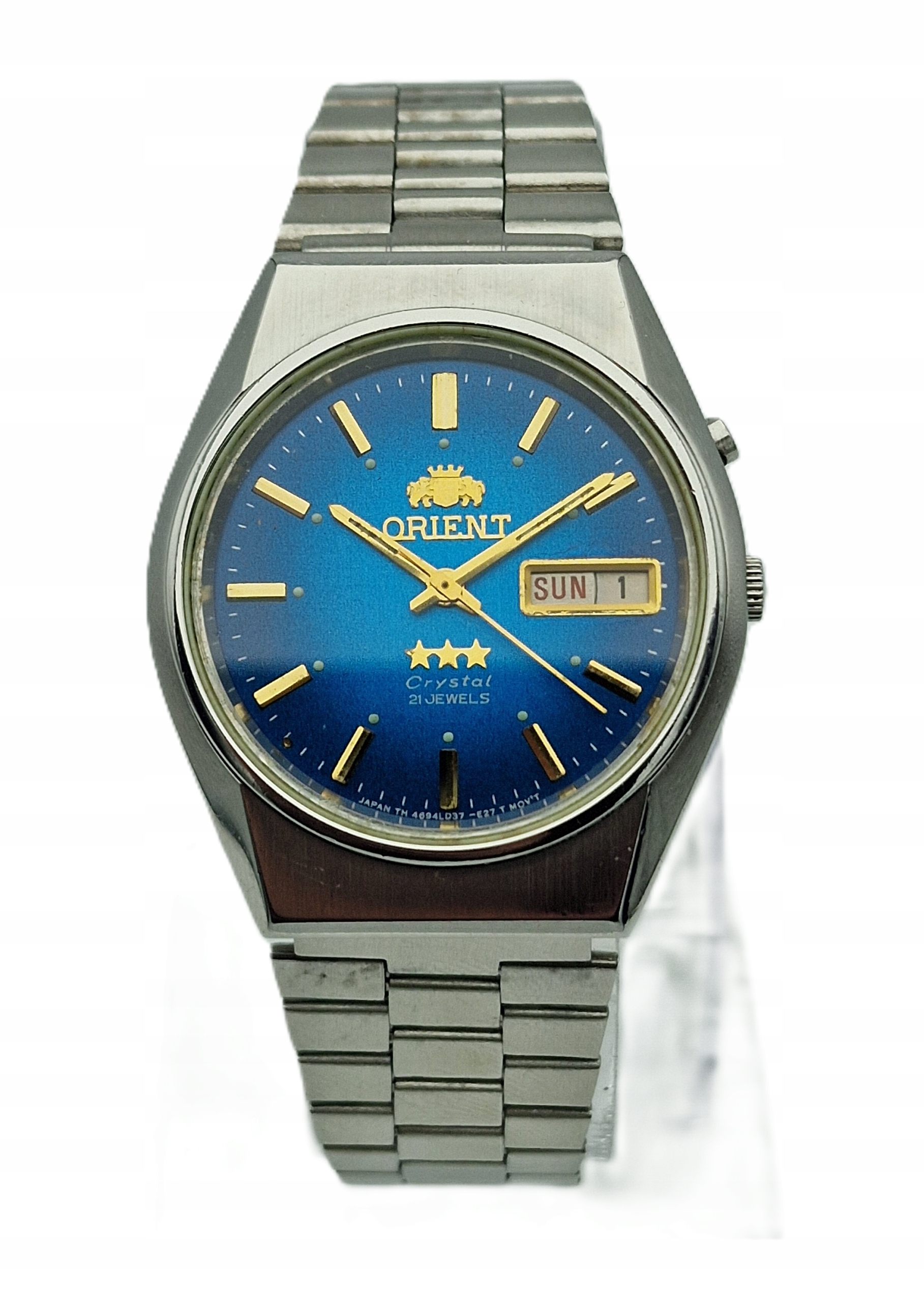 - Синій металевий циферблат із календарем на третій годині. Циферблат підписаний: «ОРІЄНТ, 21 КОШТОВНОСТІ, КРИШТАЛЬ, ЯПОНІЯ». Циферблат у ідеальному стані, як показано на фотографіях з аукціону.