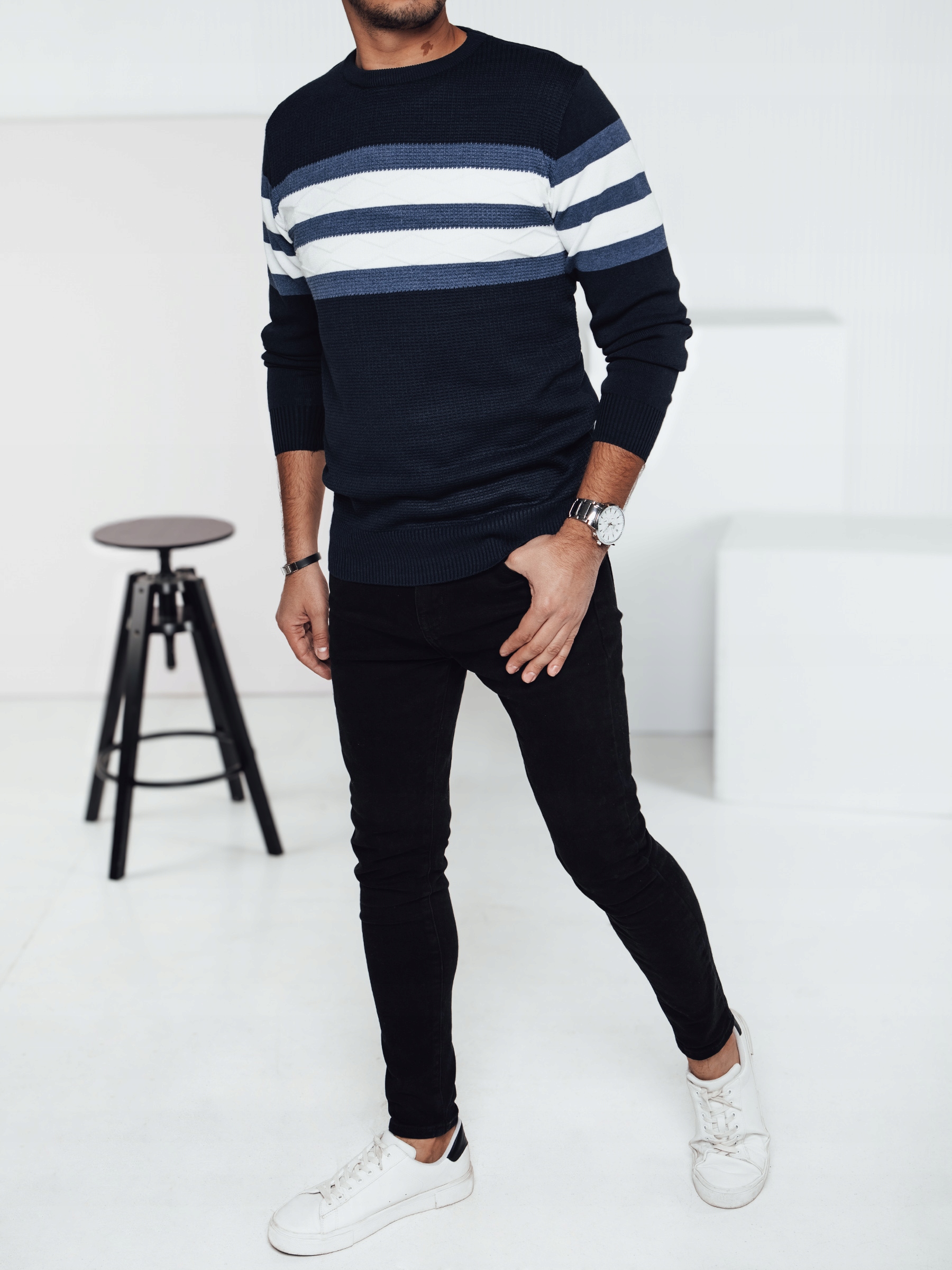 Цей елегантний чоловічий светр із сучасним вирізом - чудовий вибір для більш прохолодних днів. Виготовлений з тканини приємна на дотик, вона забезпечує комфорт та свободу руху. Характерні смуги додають стильний акцент, що робить його чудовим як щодня, так і для більш формальних випадків. Ідеально підходить для джинсів та матеріальних штанів.