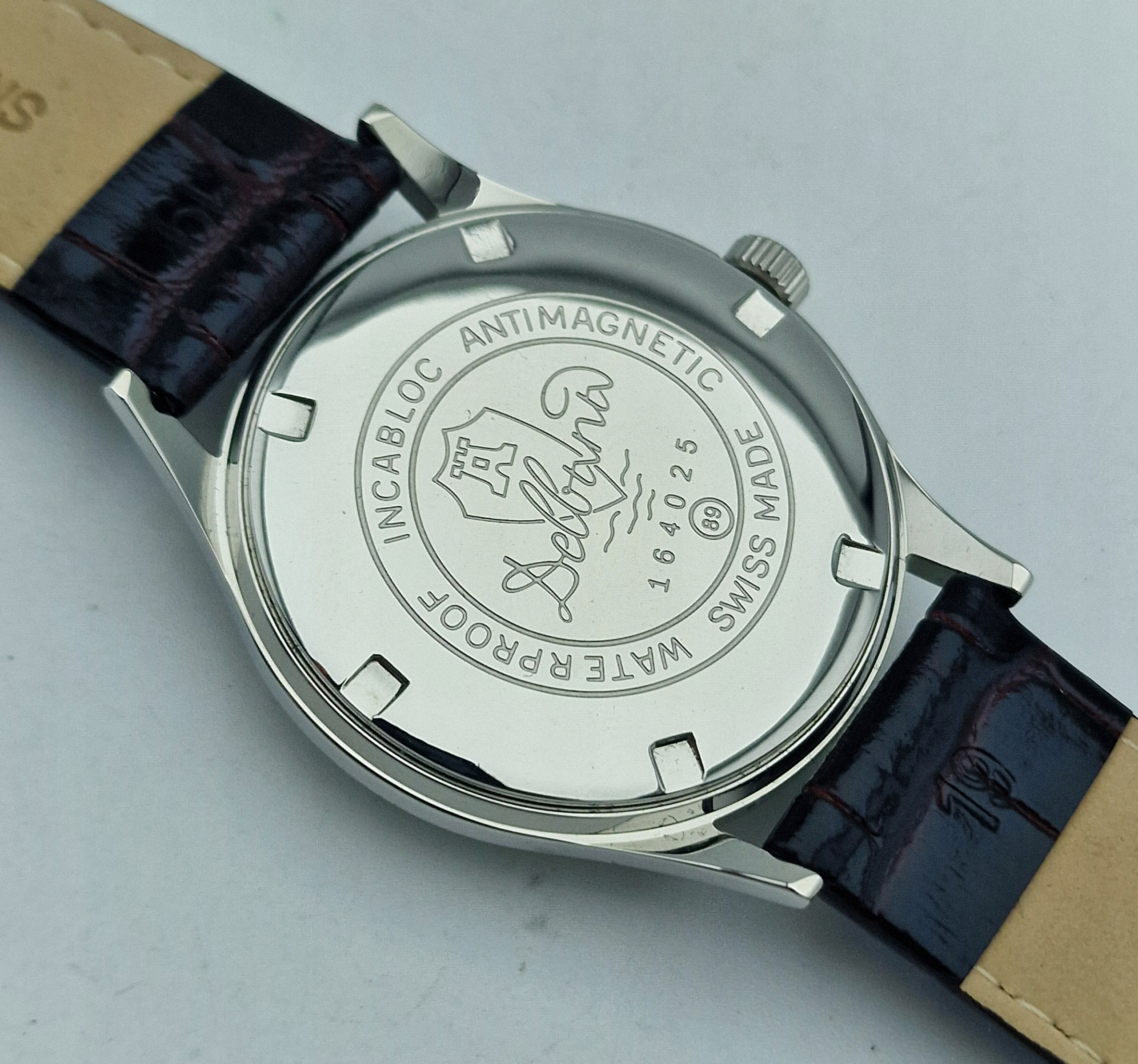 - Хромований корпус. Задня кришка закручується та має такі підписи: «WATERPROOF, SWISS MADE, ANTIMAGNETIC, INCABLOC, , DELBANA». Оригінальне мереживо з логотипом компанії в ідеальному стані. Конверт в ідеальному стані, як на фото.
