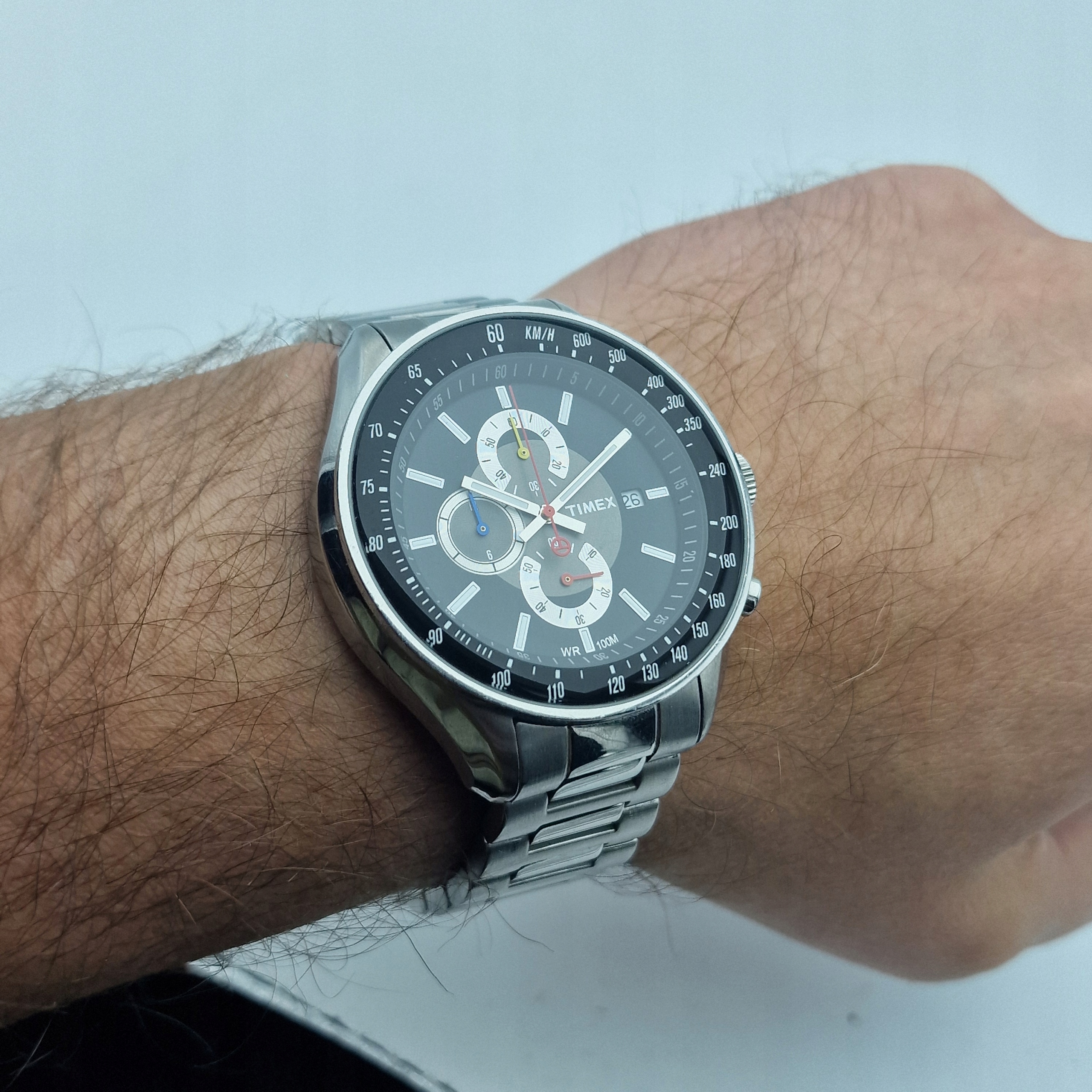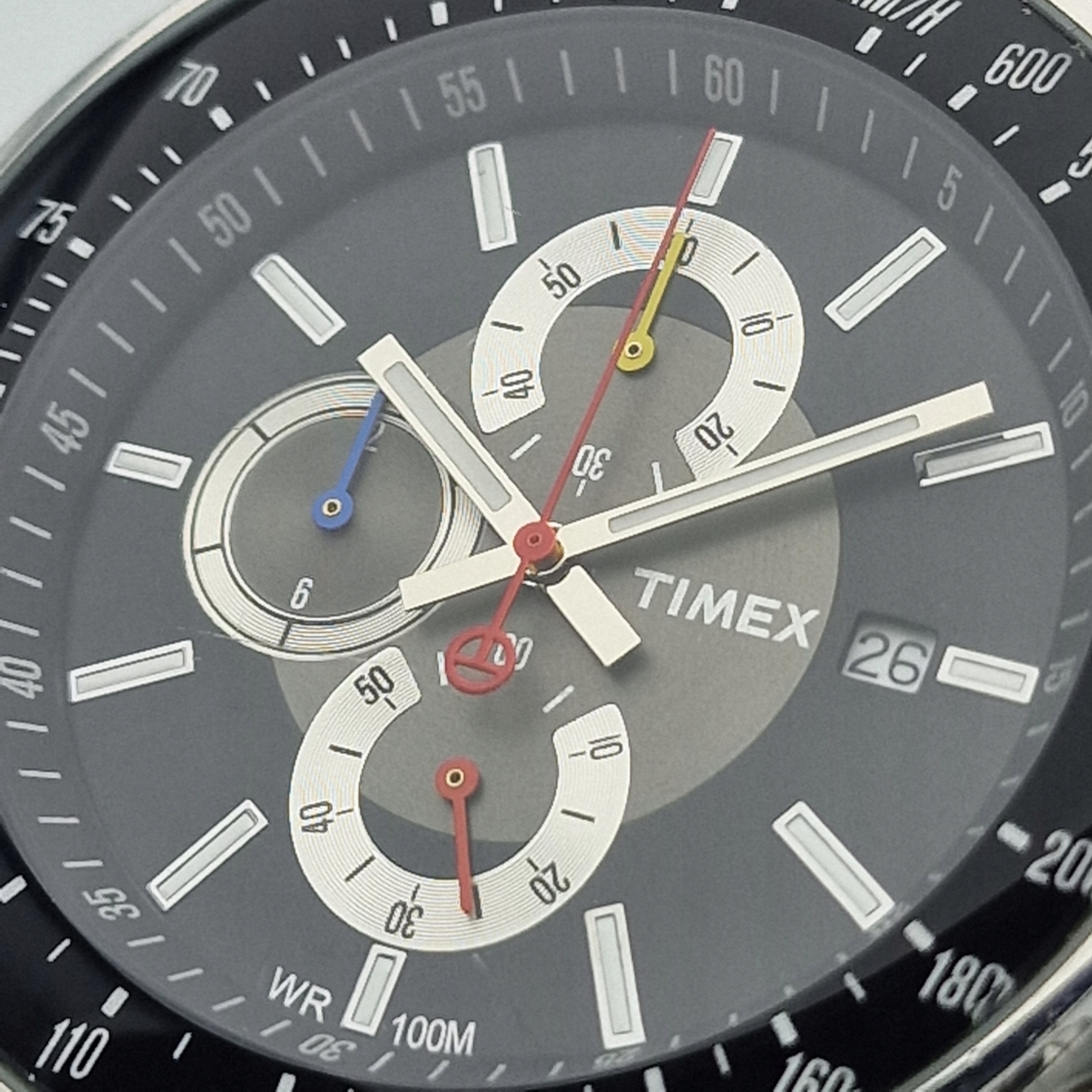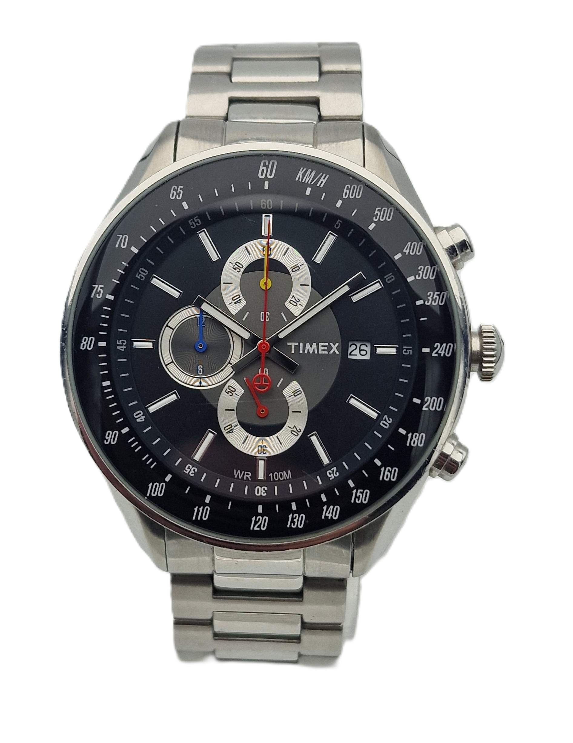 - Чорний циферблат із відображенням дати на 3 годині. Оригінальний циферблат, підпис: "TIMEX, WR100M". Циферблат в ідеальному стані, видно на фото.