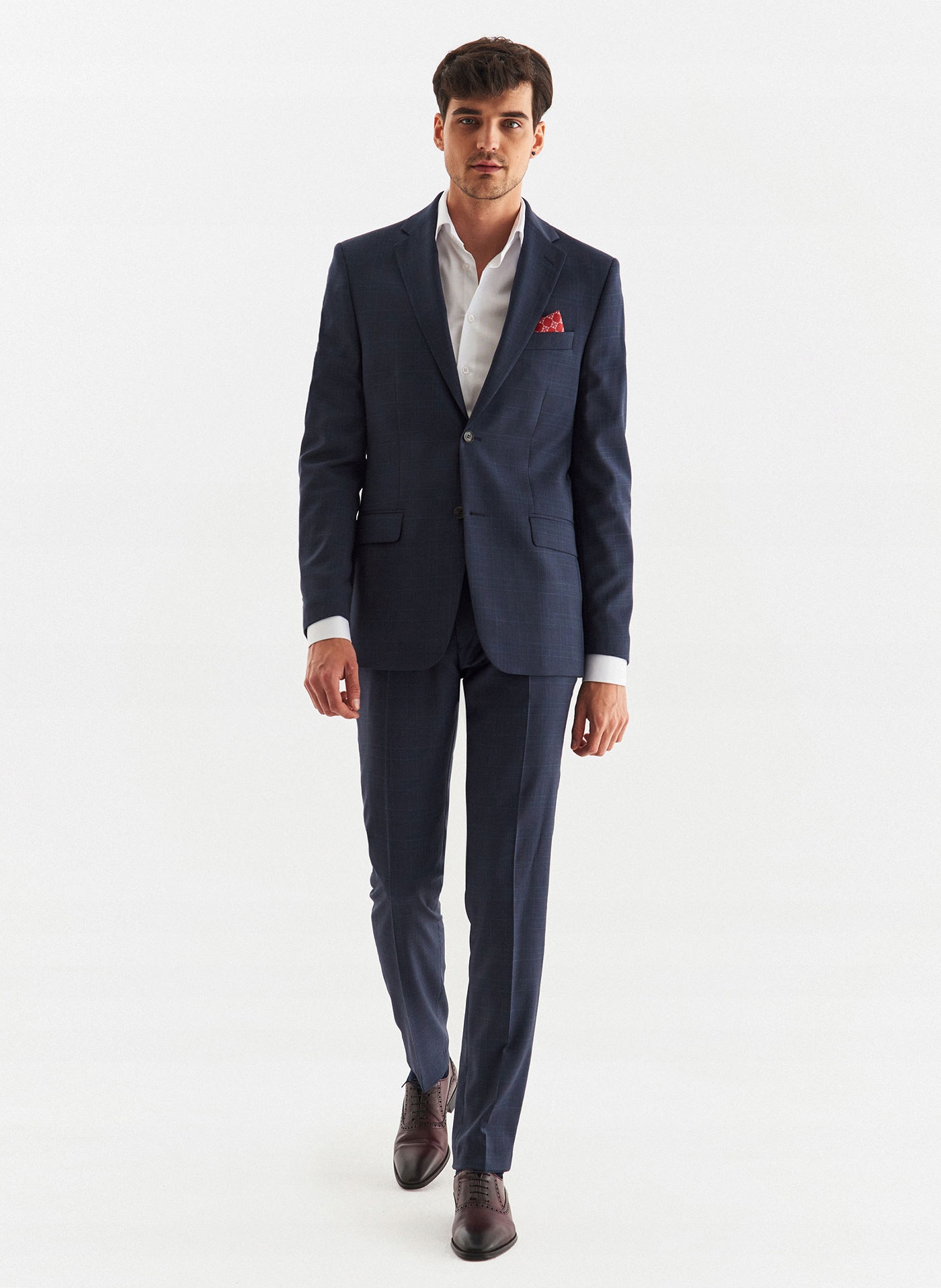 Піджак у поєднанні з темно-синіми брюками в клітку створює костюм. Він ідеально підійде для будь-якого випадку. У офіційному стилі в поєднанні з білою сорочкою, коричневими туфлями, кишеньковим платком або краваткою це створить елегантний, шикарний образ. Ви точно можете носити кожну річ окремо щодня.