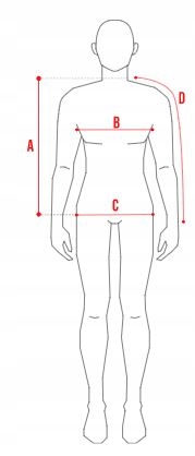 A - загальна довжина B - обхват грудей C - обхват талії D - довжина рукава