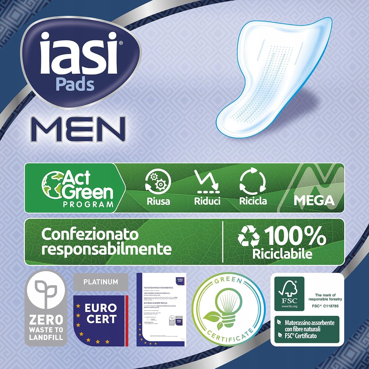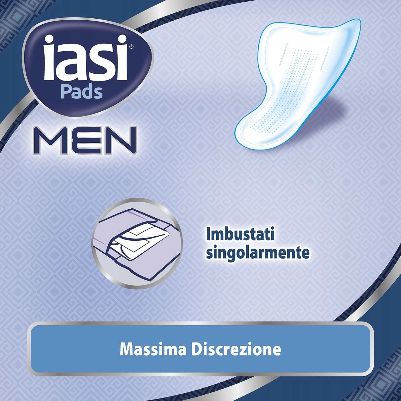 Чоловіки IASI - стрункі, анатомічні та стриманні захисні обкладинки для чоловіків з низькими проблемами нетримання сечі. У них дуже поглинаюче ядро, передні самостійні крила з трьома якоряними точками, вони стримано носять у чоловічій нижній білизні. Вони упаковуються індивідуально на власний розсуд. Доступні на 2 рівнях поглинання: рівень 2 та 3.