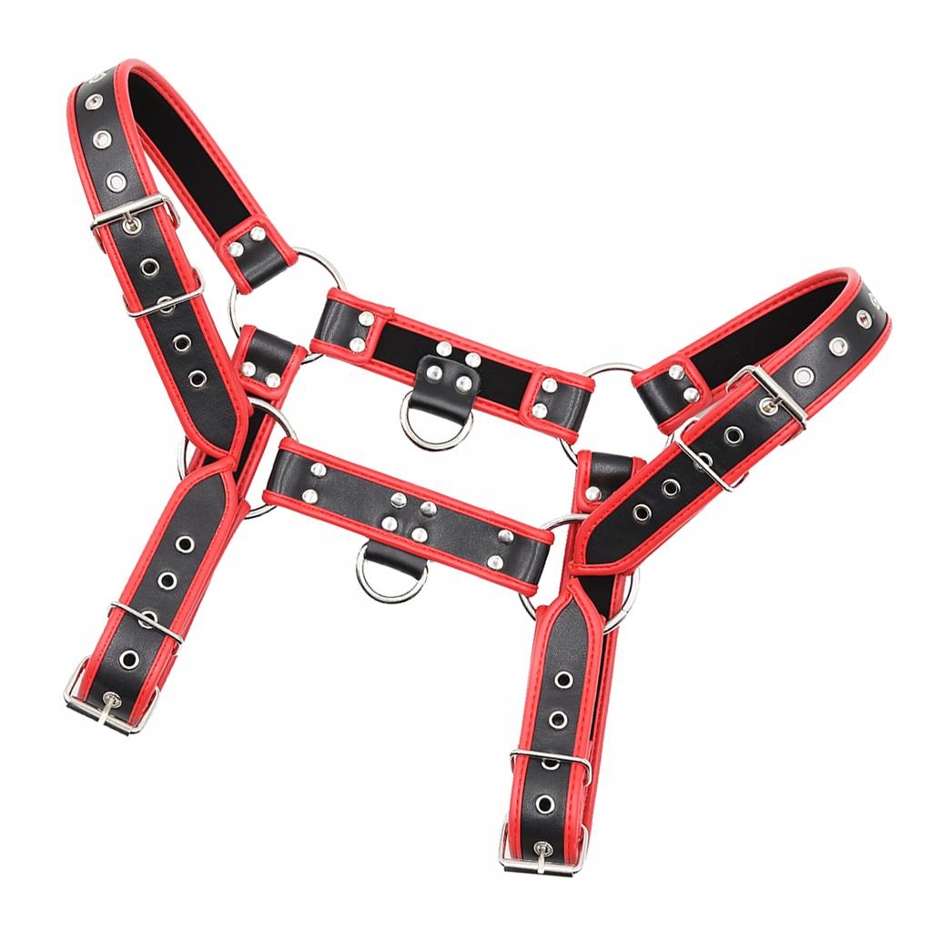 Men's leather harness with a chest belt, metal dowels and rings, adjustable clamps, one size fits most