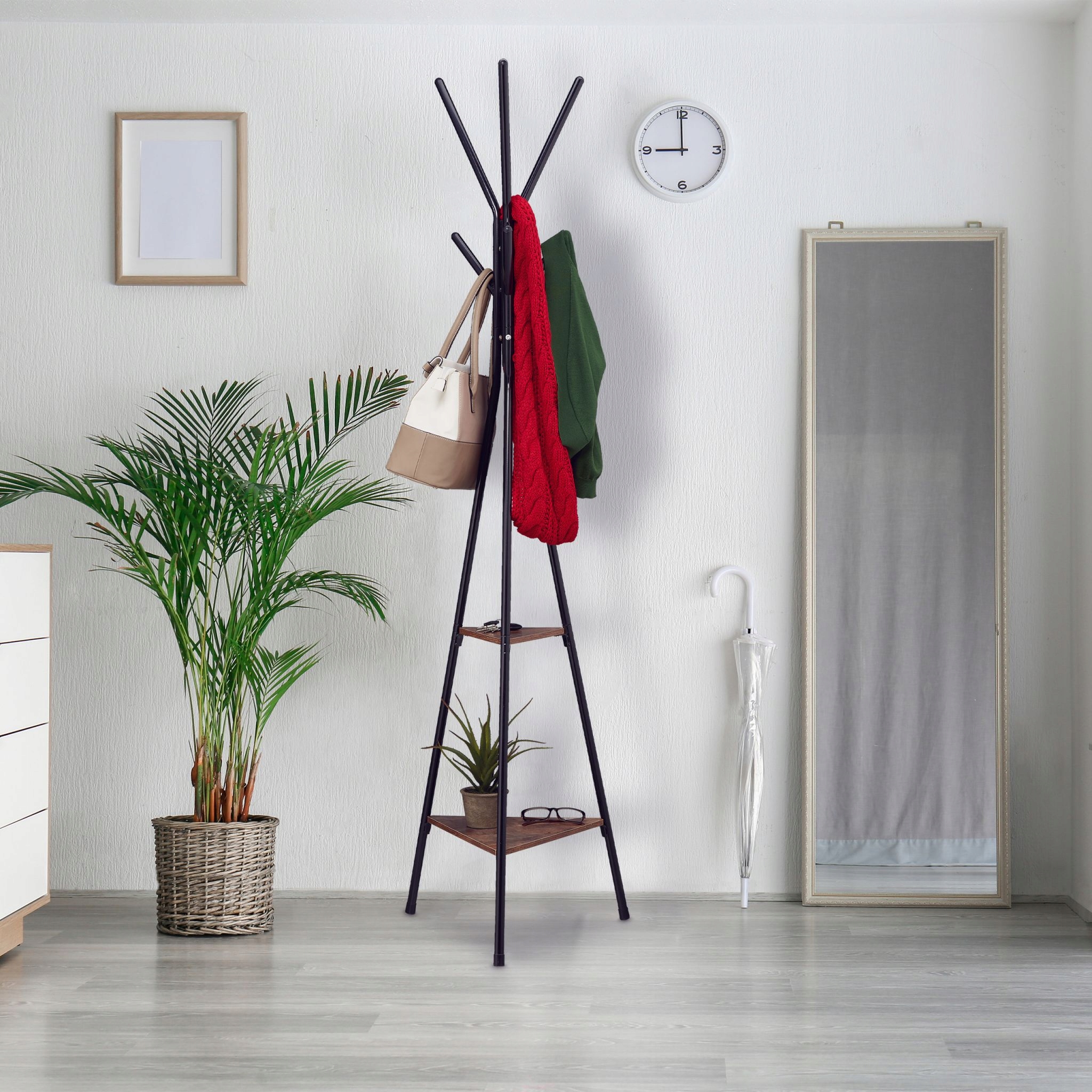 Ця сучасна вішалка для піджаків пропонує достатньо місця для піджаків, пальто, шарфів, сумки та іншого одягу завдяки загальній 6 гачках. Ключі, шапки, прикраси та інші аксесуари можна зберігати на 2 полицях. Безкоштовна вішалка для одягу зі стабільною триногим кадром можна встановити відповідно до потреб в офісі, передпокої чи спальні. Там вішалки переконують особливо промислову суміш чорного металу та коричневої деревної оптики. офіс, спальня тощо