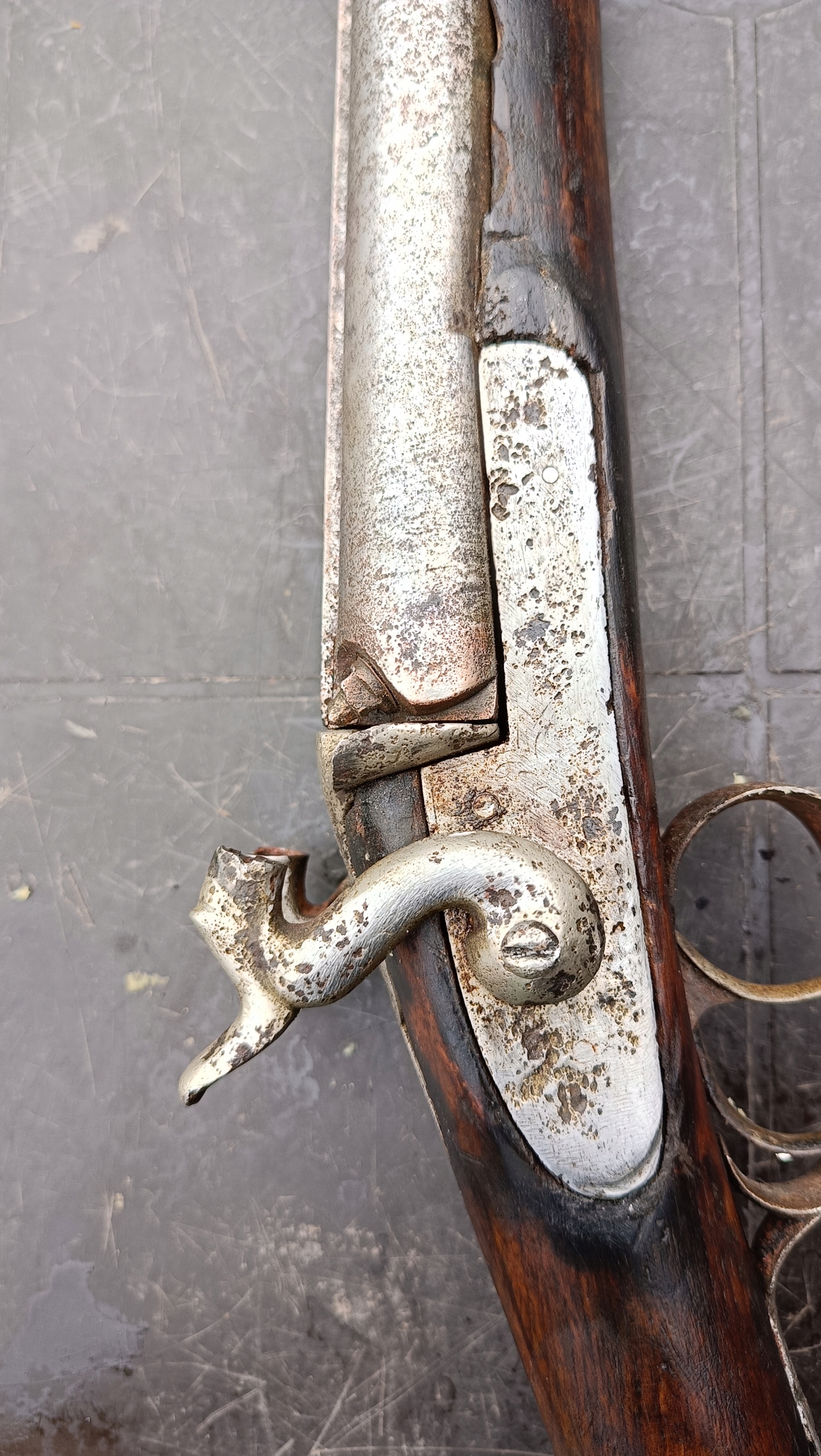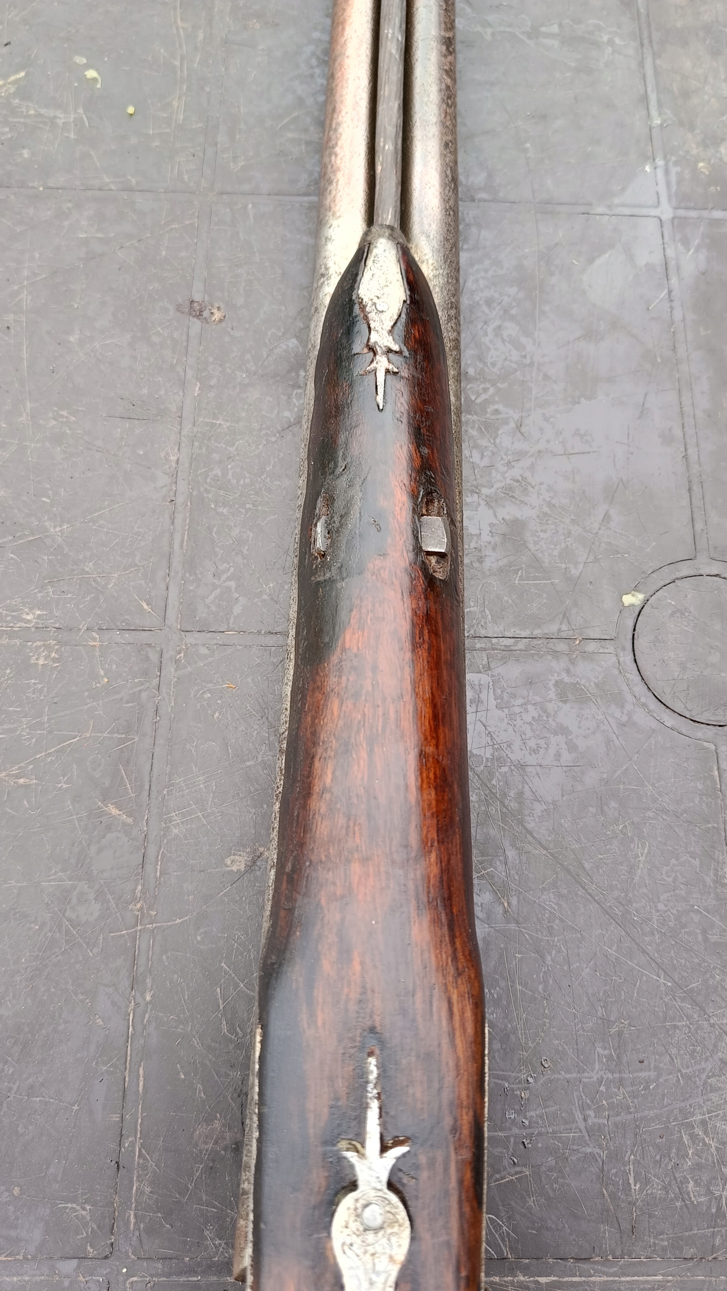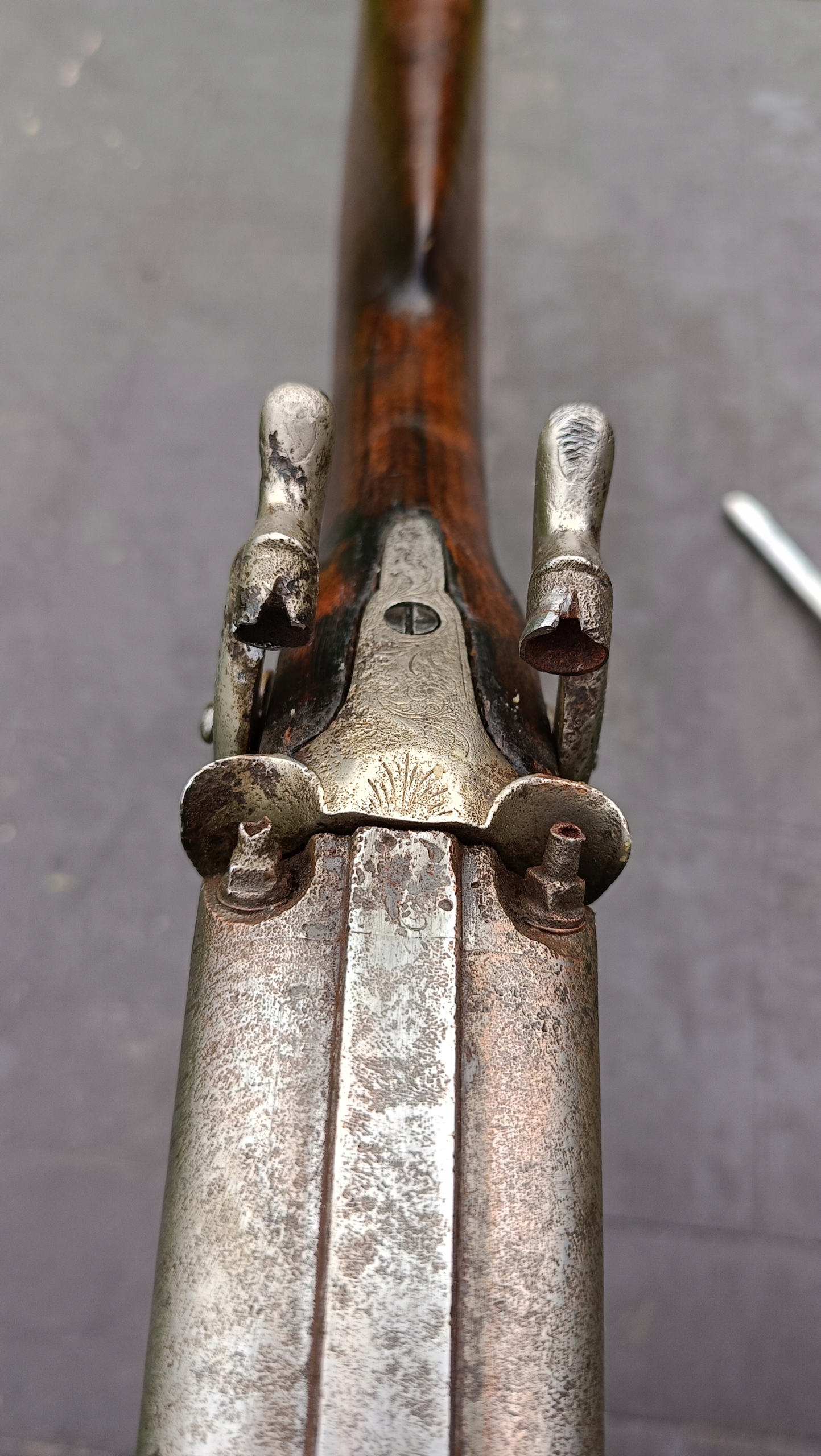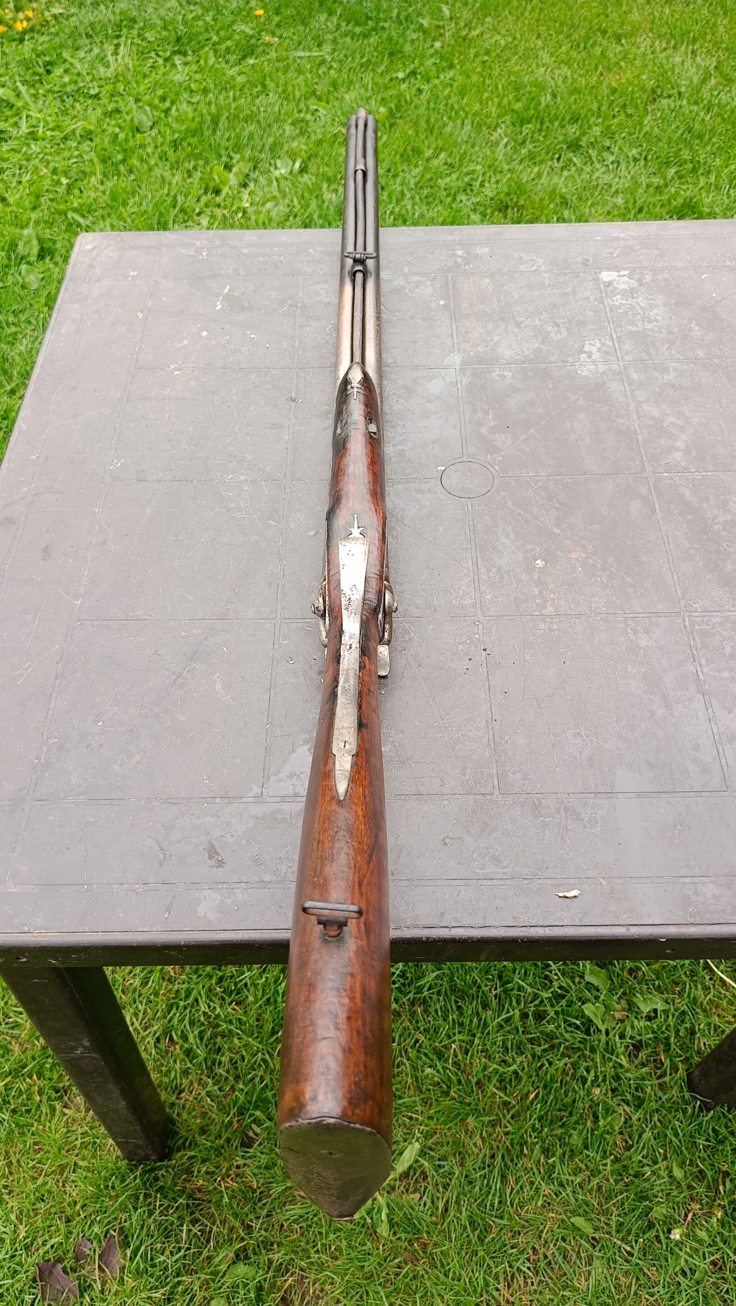 завантажений з фронту. Можна вистрілити сухий постріл, подвійне напруження. Замки тригера затягнуться 2 смуги. Проста бочка в поганому стані через їх біль. Дерево без тріщин у досить хорошому стані. Каміни, які потрібно замінити.