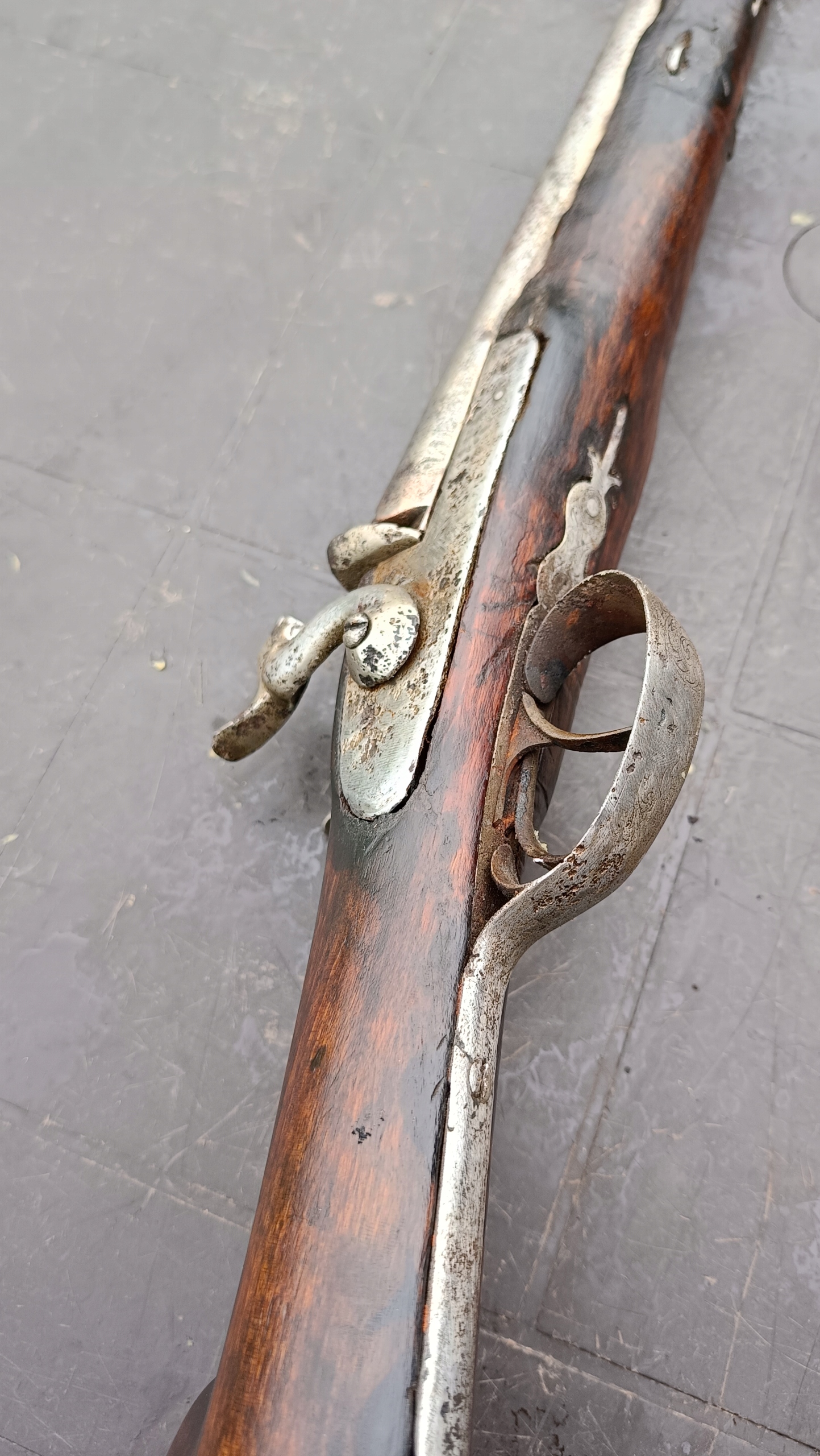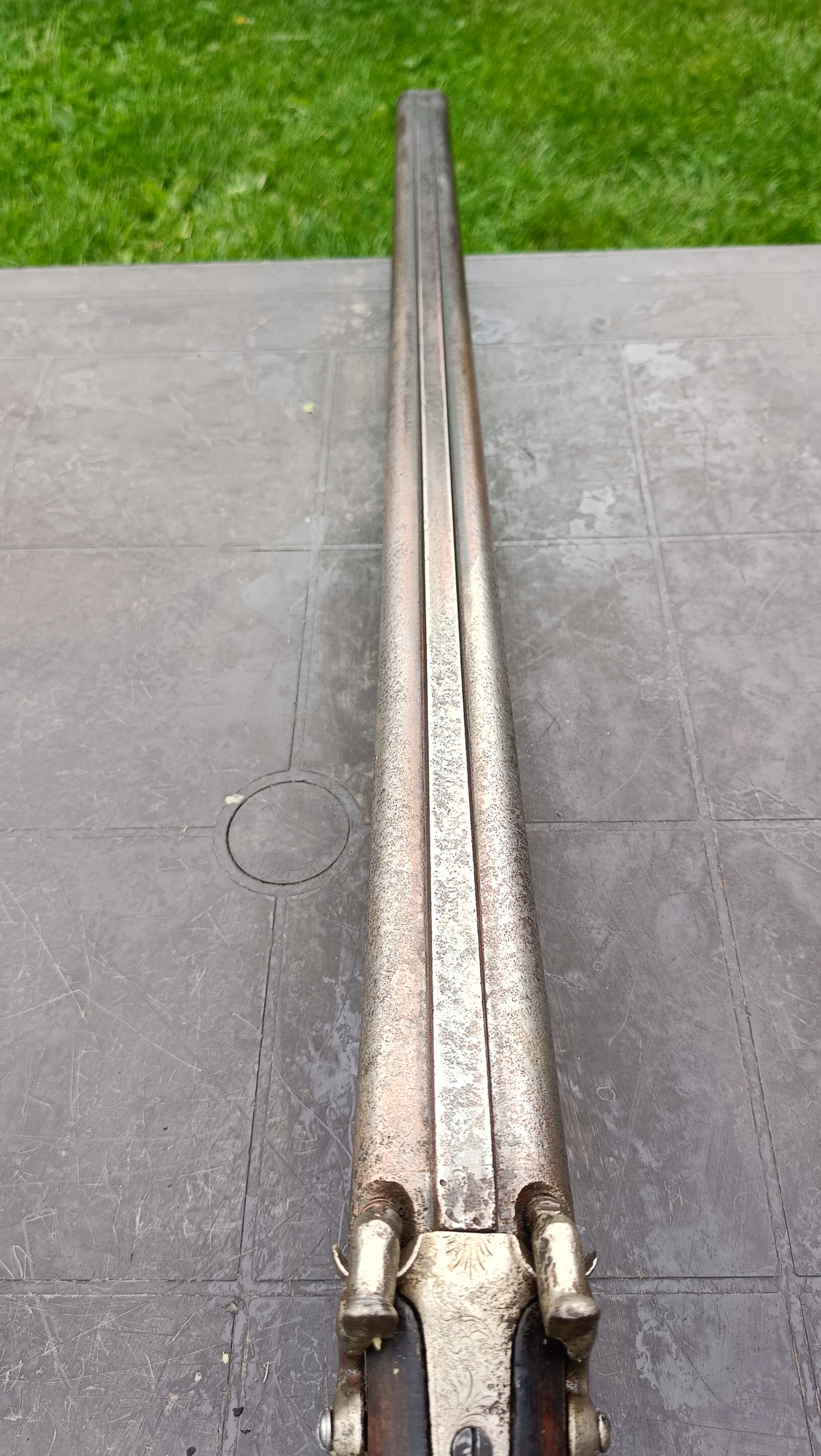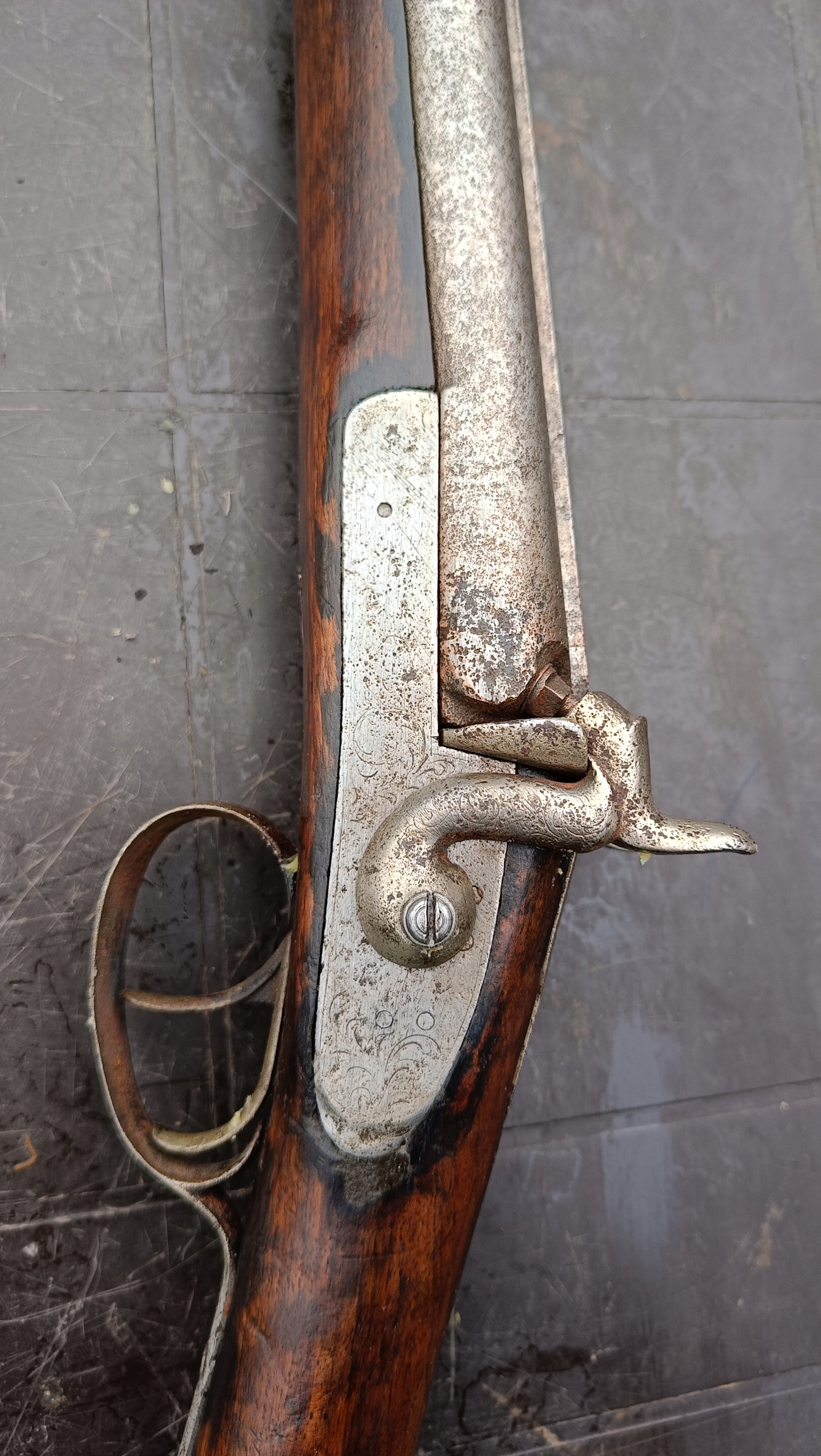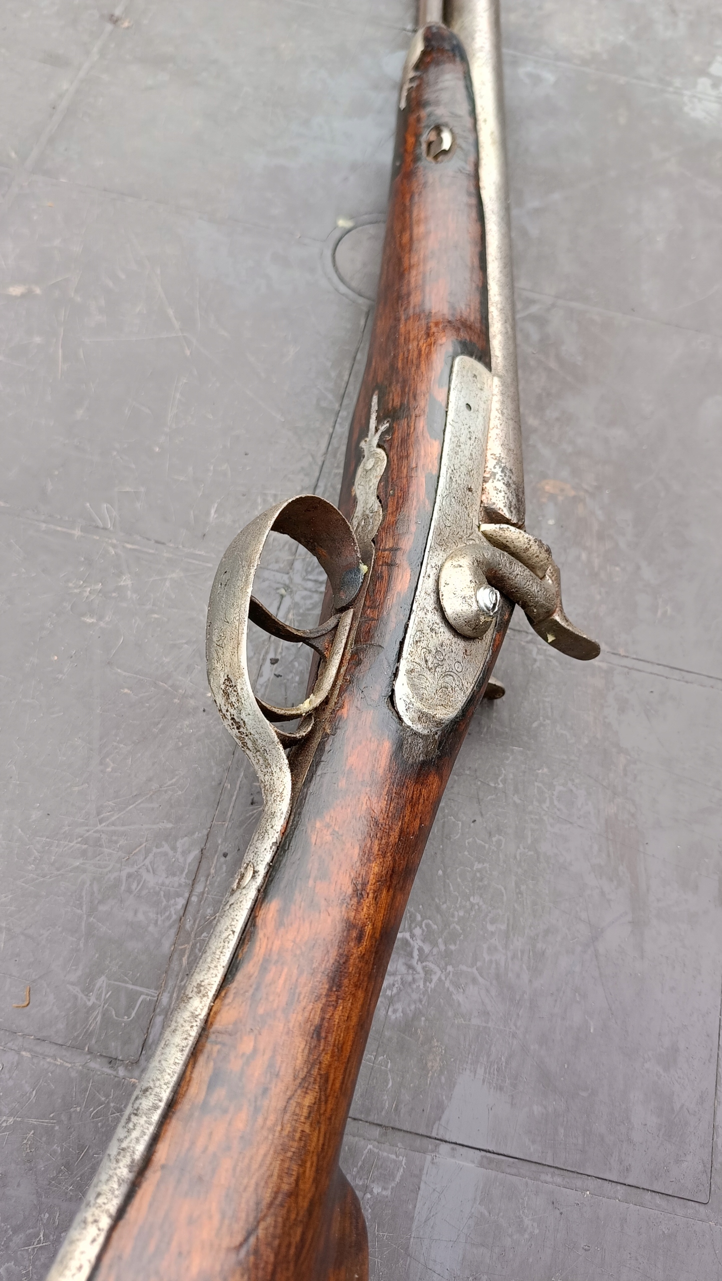 завантажений з фронту. Можна вистрілити сухий постріл, подвійне напруження. Замки тригера затягнуться 2 смуги. Проста бочка в поганому стані через їх біль. Дерево без тріщин у досить хорошому стані. Каміни, які потрібно замінити.