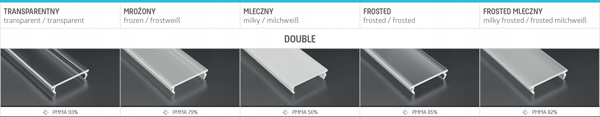 Накладки профілю являють собою плоску пластикову кришку. Доступні в чотирьохрівнях пропускання залежно від білизни матеріалу, вони доступні в одній версії використаного матеріалу: PMMA