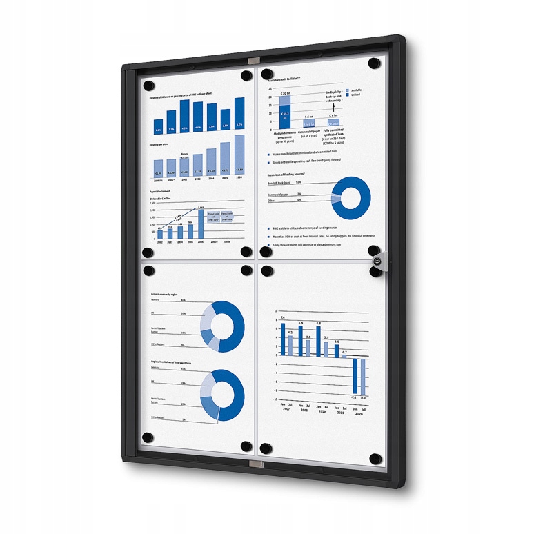 Інформаційна вітрина на магнітному замку з алюмінієвих профілів, пофарбованих у чорний колір. Задня частина вітрини виготовлена з листового металу з порошковим покриттям, що робить поверхню магнітною і дозволяє писати маркерами. Ідеальне рішення для сходів, офісів, офісів, шкіл тощо.