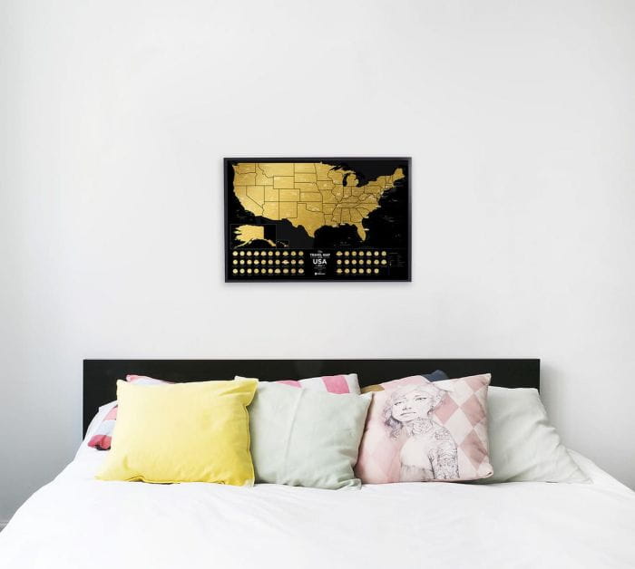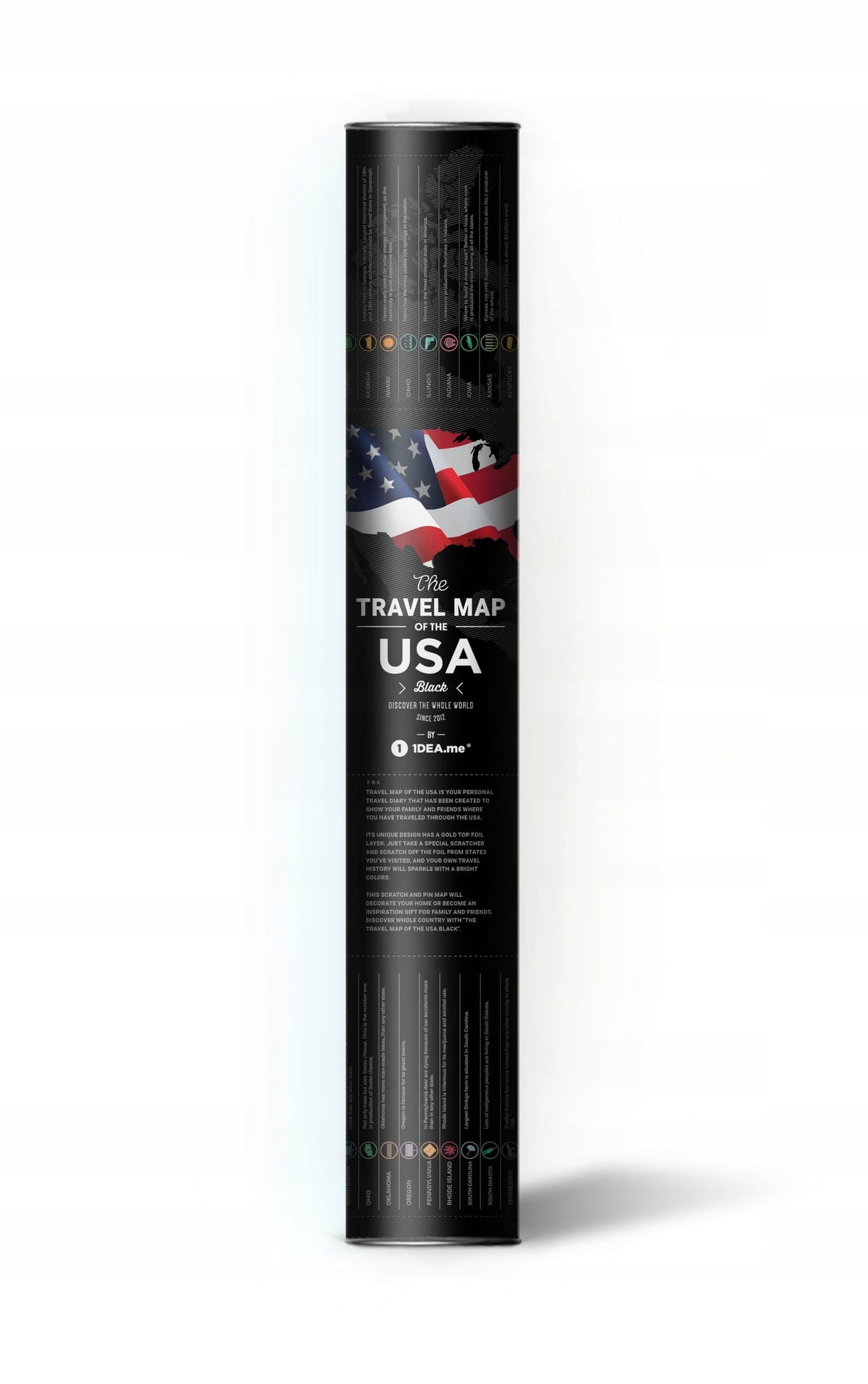 Travel Map™ USA Black — це чорна карта Сполучених Штатів із золотистим покриттям. Ви можете легко позначити на карті штати, які ви відвідали, і знайти їх символи. Просто скористайтеся доданим кубиком, щоб вийняти золоту скретч-картку та відкрити для себе місця, де ви вже були, створивши вражаючий запис своїх подорожей США. Карта підходить для сучасних і креативних інтер'єрів. Вона також підійде як подарунок любителям США.