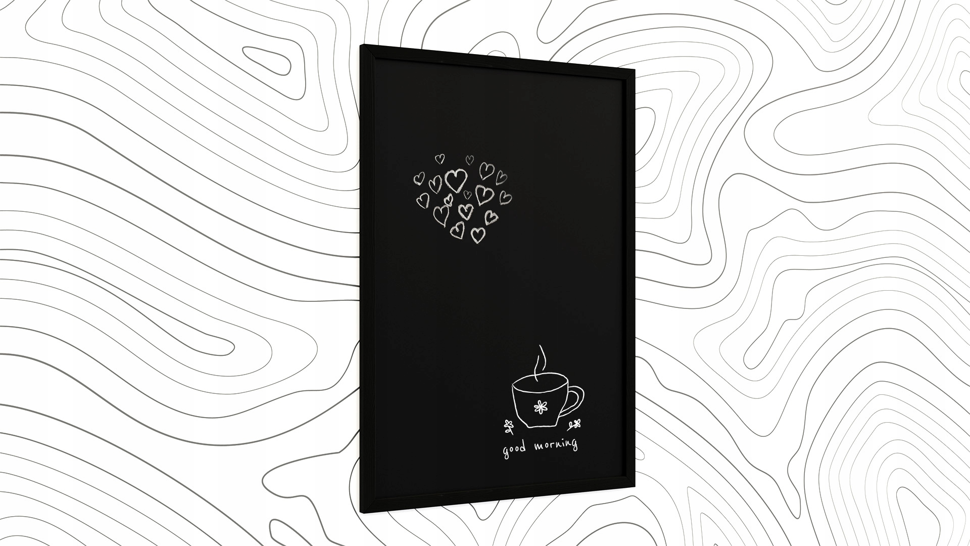Крейдяна чорна поверхня дошки укладена в елегантну рамку з дерева, покритого чорним лаком. Конструкція міцна і стійка, зберігаючи легкість. Поєднуючи функціональні та естетичні цінності, ви отримуєте стильний продукт, який підходить для різних сфер життя.