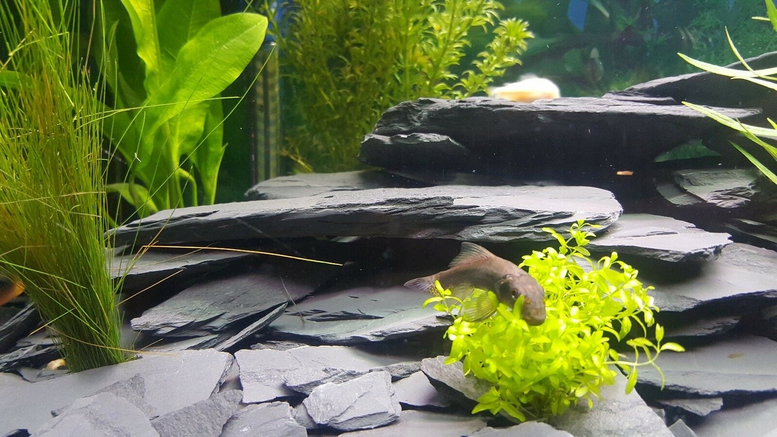 ➡ темна, тонка плитка чорного шиферу-відмінний вибір для розташування акваріуму. в контакті з водою, каміння сильно темніє, і під впливом пишності освітлення води.