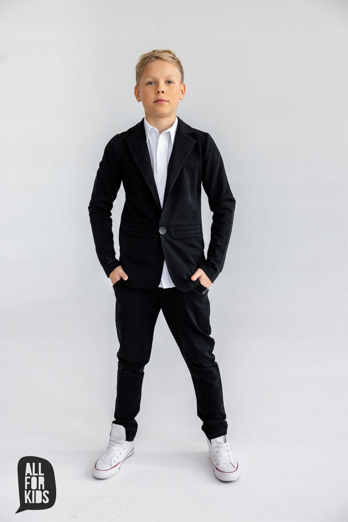 Чорна куртка для любителів спортивної елегантності. Модна куртка для хлопчика була створена в Польщі брендом All For Kids зі зручної в носінні світшотної тканини.