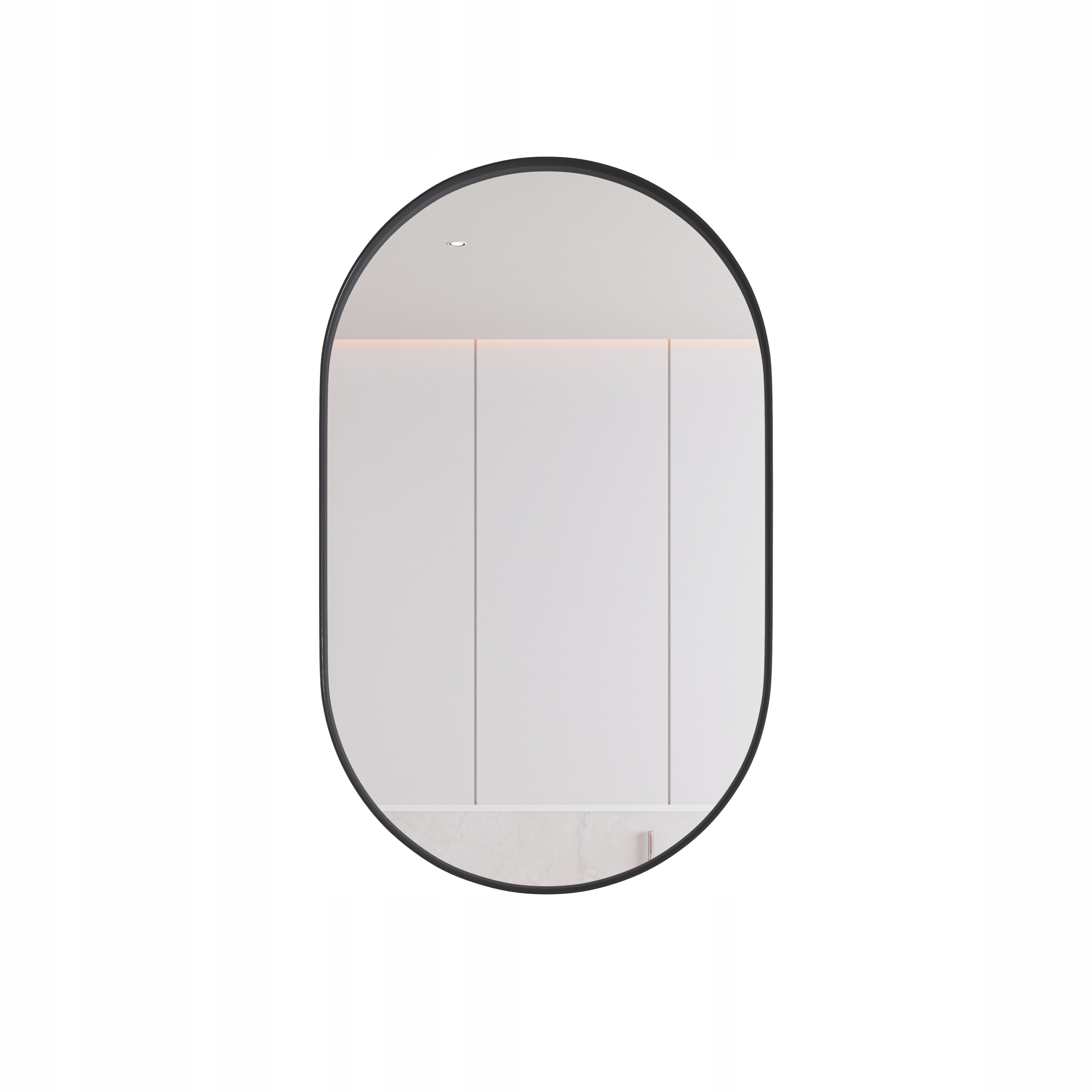 Чорна овальна шафа з дзеркалом і регульованими полицями.