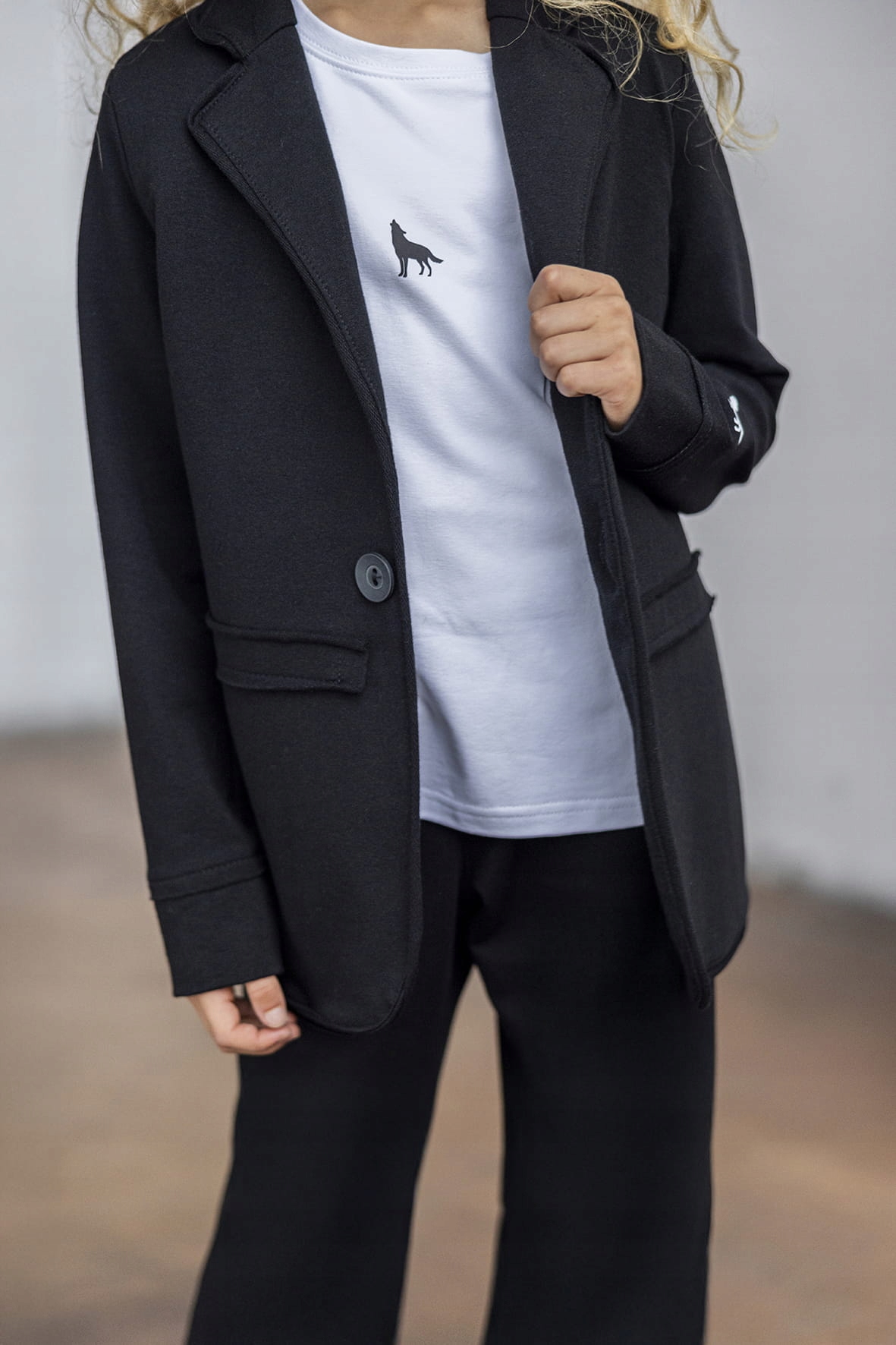 Куртка з чорної сукні вовка для шанувальників спортивної елегантності. Модна дитяча куртка була розроблена як для дівчини, так і для хлопчика. Він був створений польською маркою Mash з високоякісної тканини з толстовки, що робить її приємною в контакті зі шкірою та зручним для носіння.
