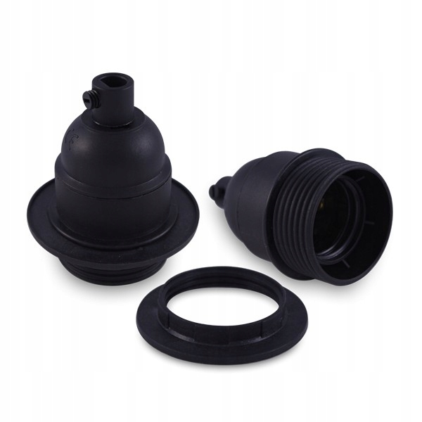 • чорний пластиковий патрон для лампи • діаметр тримач ~38 мм • діаметр кільця ~58 мм • висота ~54 мм • з кільцем • чорний кабельний замок у комплекті • різьба E27 • ідеально підходить для кабелів 2 X 0,75 мм2