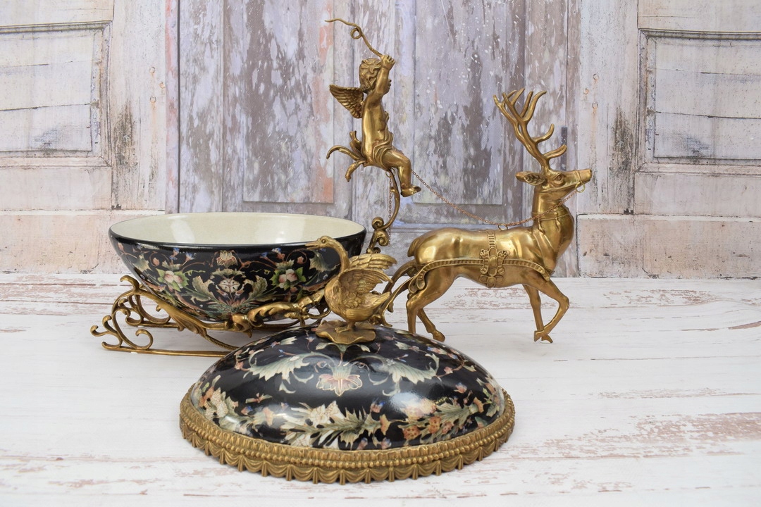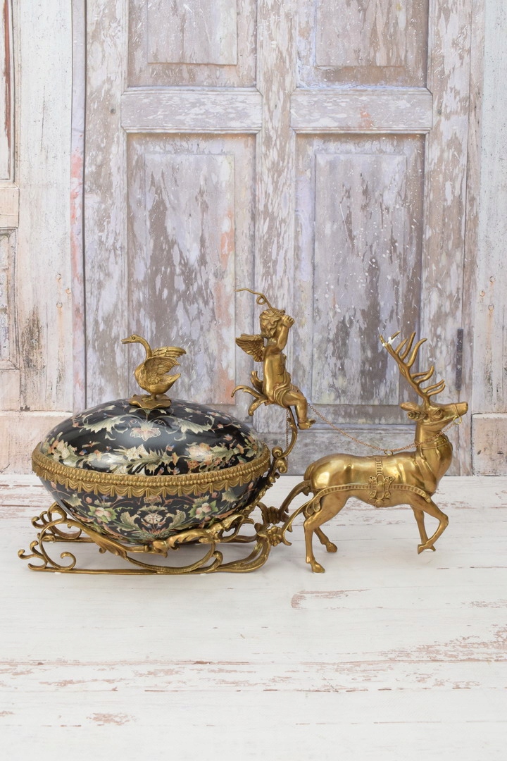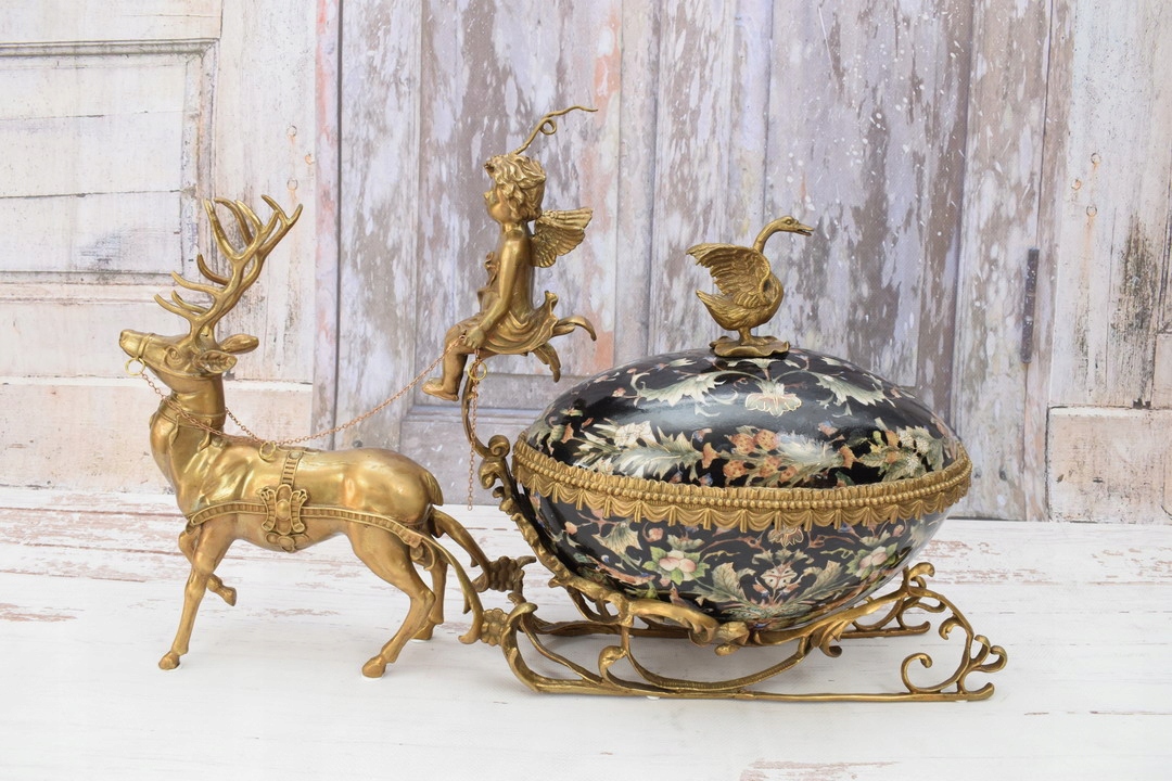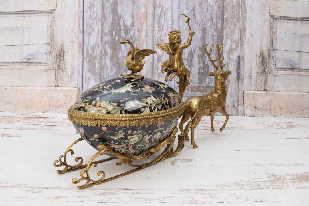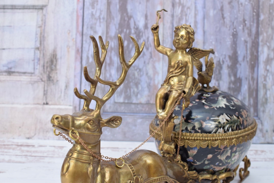 Чорна порцелянова коробка з санями - бронзова фігура оленя - Купідон на возі
