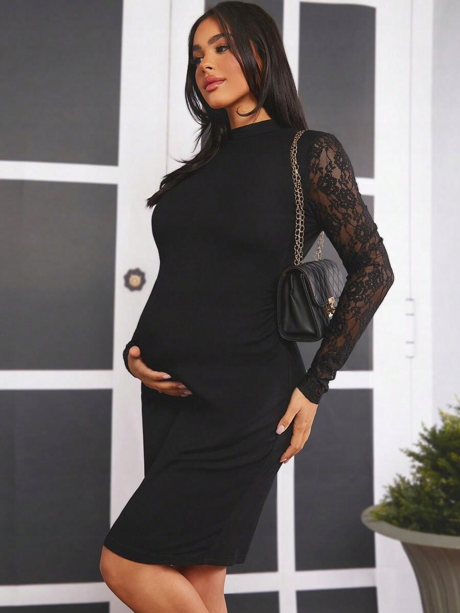 Чорна приталена сукня для вагітності Довгий мереживний рукав Shein 40/42