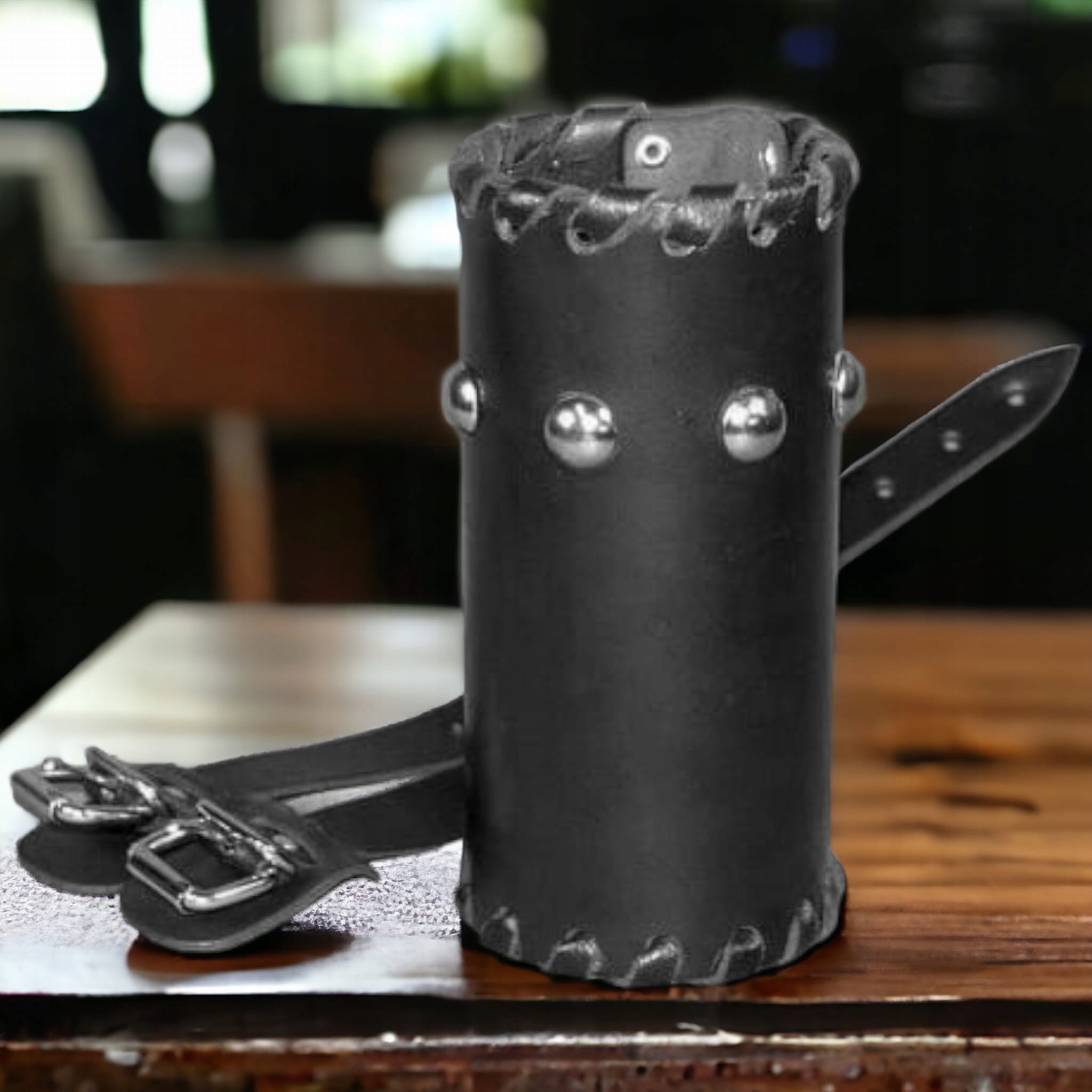 Чорна шкіряна ручка для мотоцикла для пляшки - з шпильками