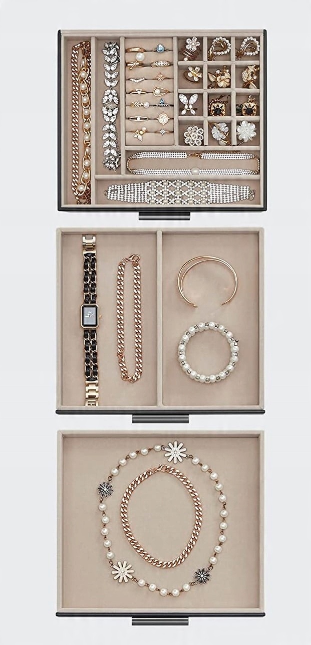 Елегантна триярусна скринька для коштовностей з оксамитовою підкладкою та скляною кришкою.