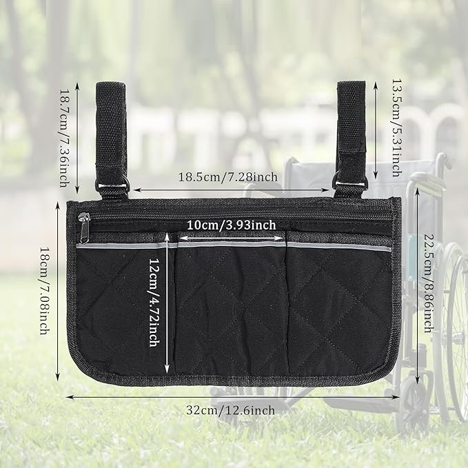 Практична сумка-чехол для підлокітника коляски - незамінний аксесуар, який допоможе вам бути організованим і мати все під рукою. Завдяки численним кишеням ви можете зручно зберігати дрібні речі, такі як телефон, гаманець, ключі або пляшку води. Надійна робота та функціональний дизайн роблять сумку ідеальною для щоденного використання.