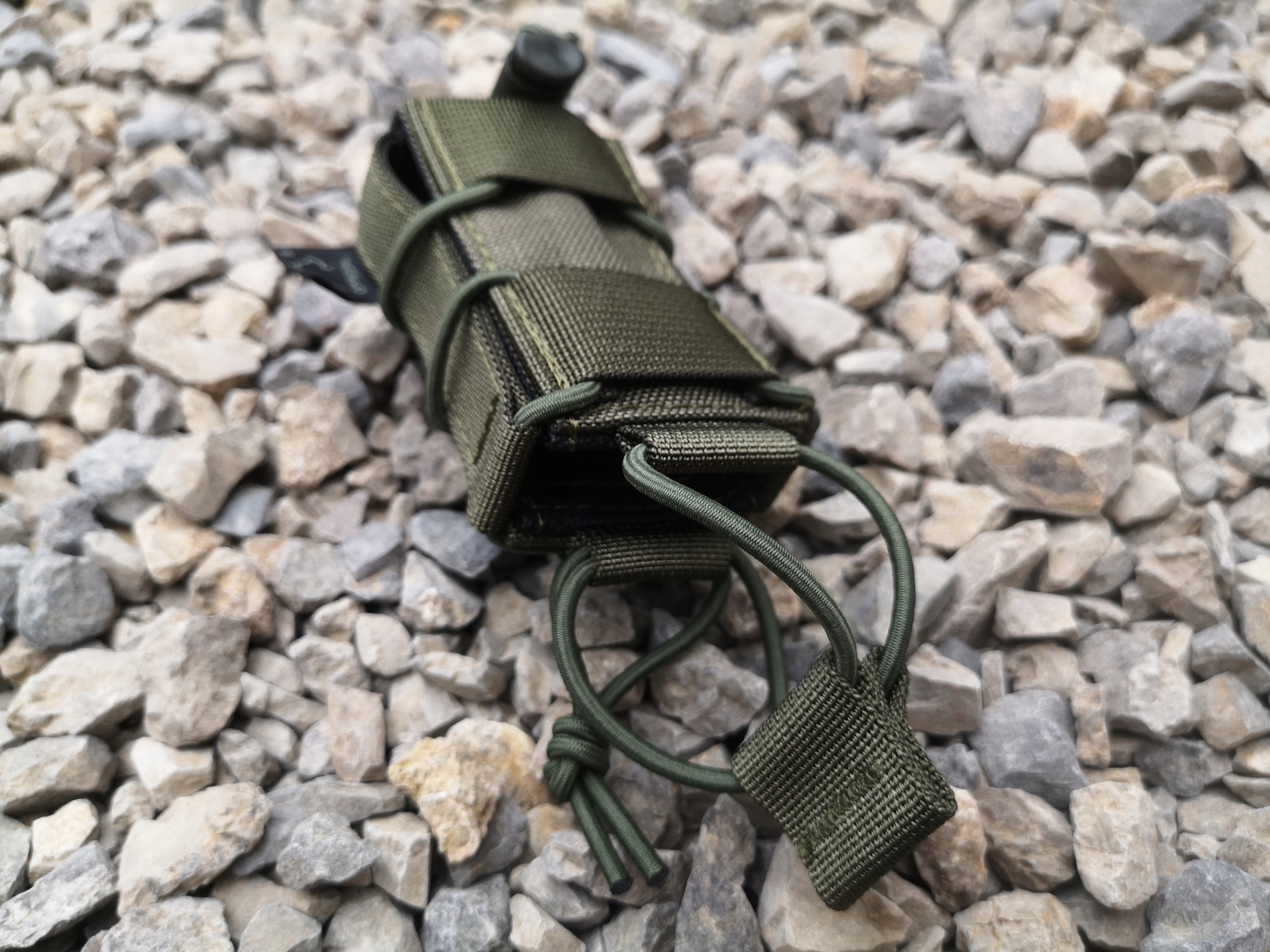Підсумок гонтового типу, відкритий, призначений для швидкого виймання магазину. Всередині є гумовий матеріал, який добре утримує вміст. Крім того, силу затиску можна регулювати за допомогою ударного шнура навколо сумки. Усе це робить підсумок надзвичайно універсальним.