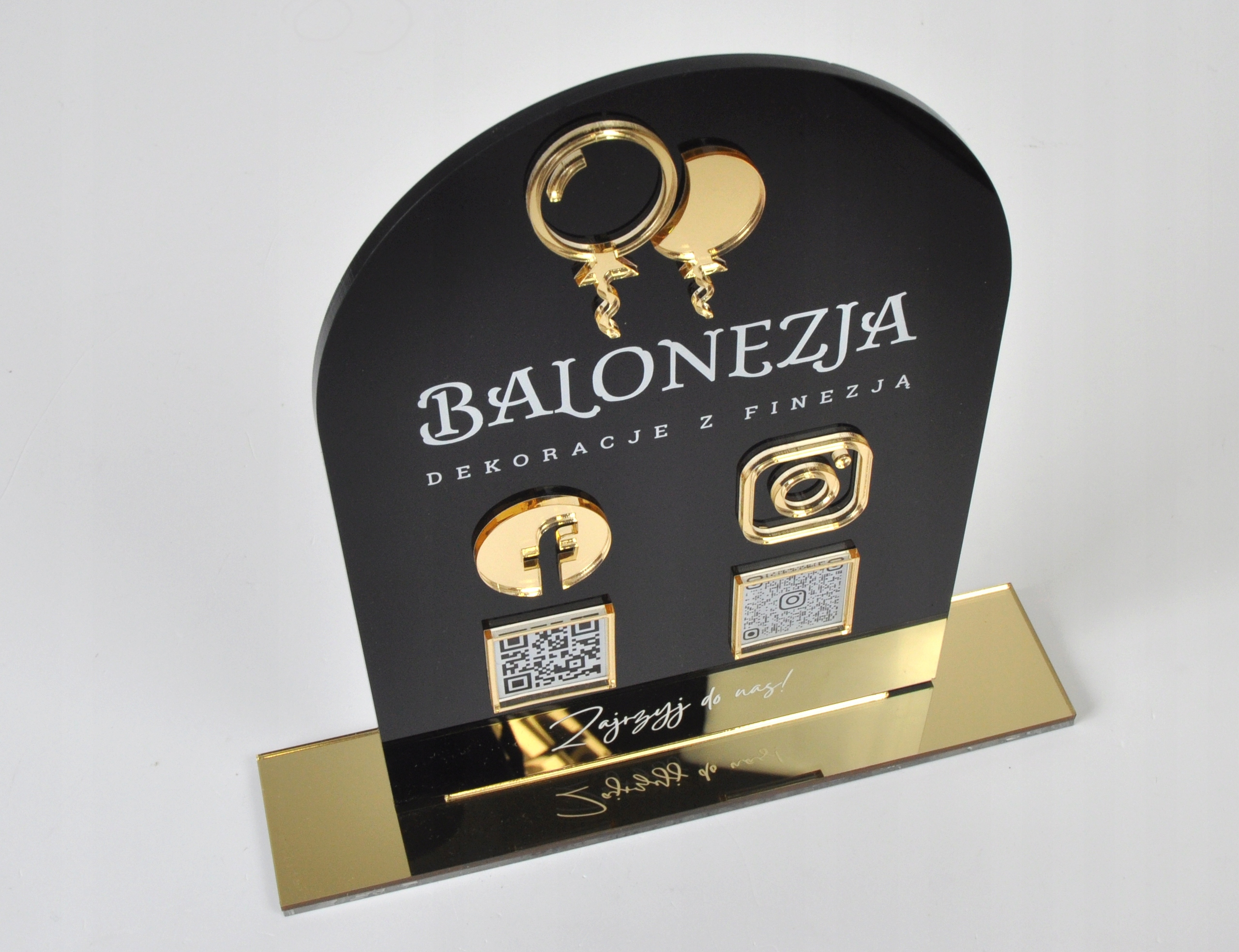 Вивіска виготовлена з високоякісного оргскла чорного кольору товщиною 5 мм. Він створений за допомогою сучасних технологій лазерного різання та УФ-друку. Додатково статуетка прикрашена золотими елементами з дзеркального оргскла товщиною 3 мм. Підставка виготовлена з прозорого та золотого оргскла. Усе це створює елегантну композицію, яка, безсумнівно, приверне увагу ваших клієнтів і спонукатиме їх стежити за вашим розвитком у соціальних мережах.