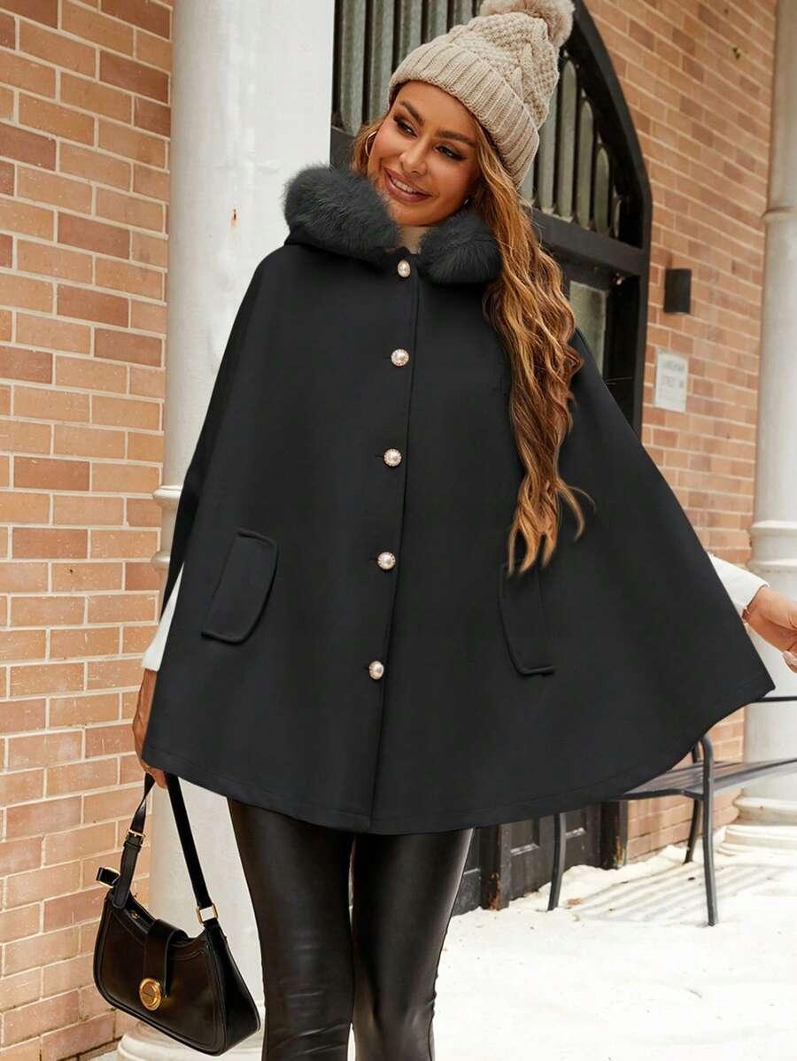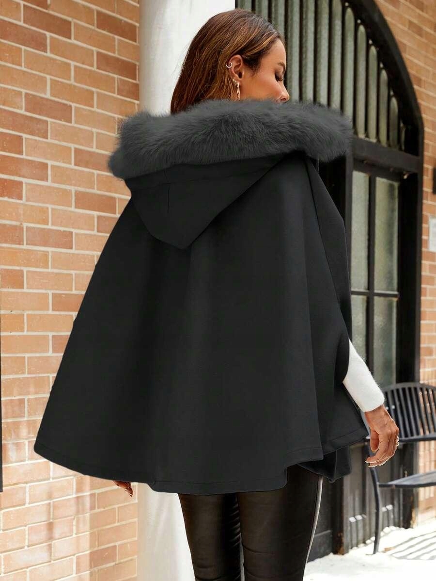 ЧОРНЕ КЛАСИЧНЕ КОРОТКЕ ПРЯМЕ ПОНЧО З КАПЮШОНОМ КИШЕНІ SHEIN L
